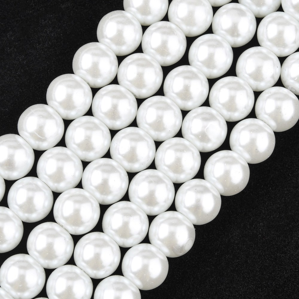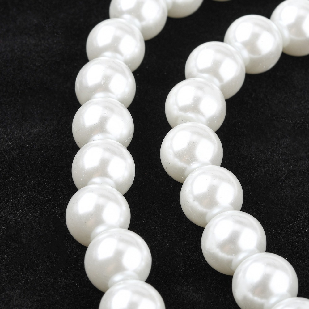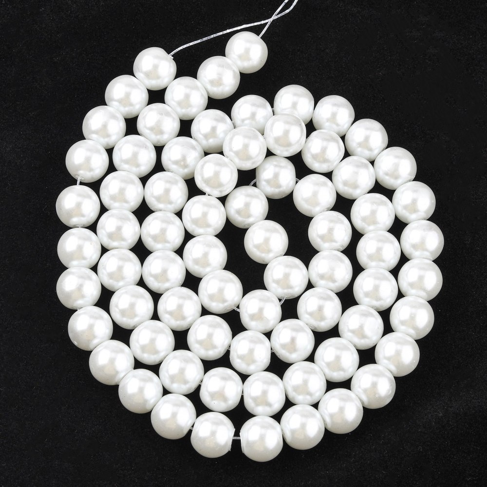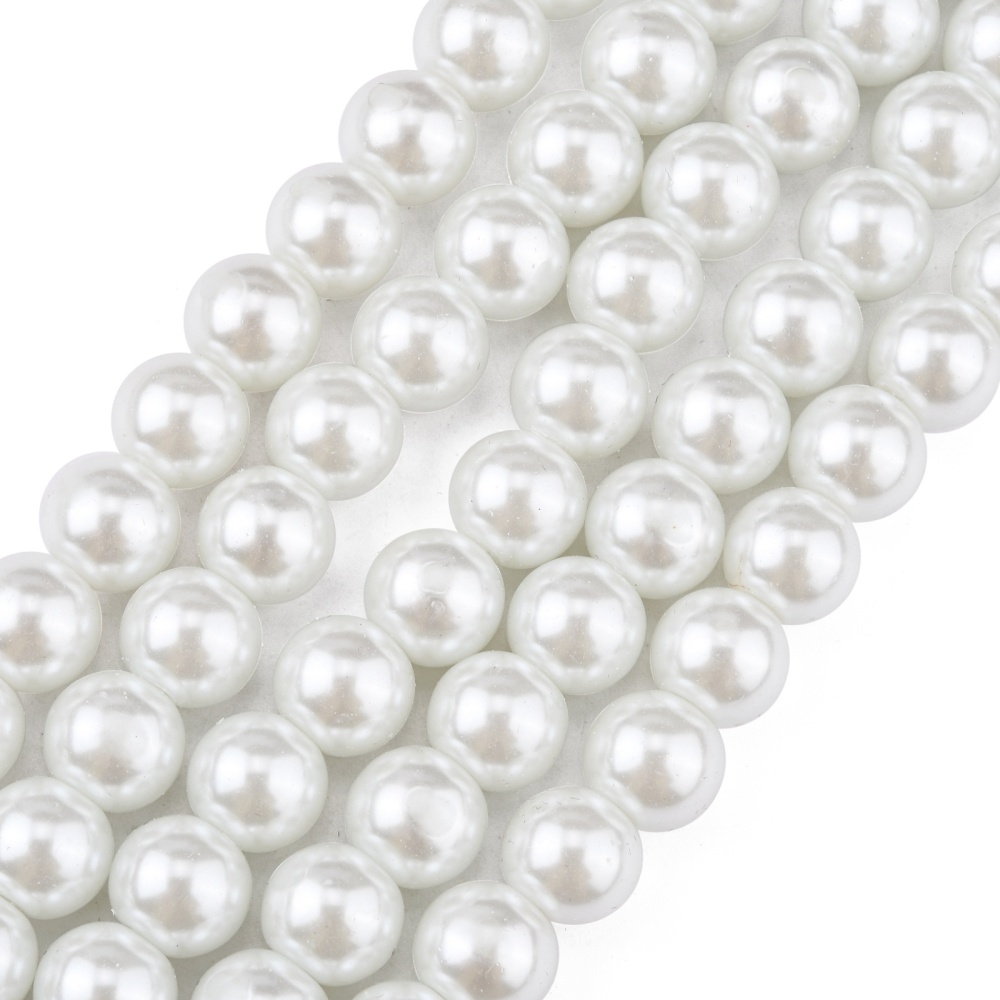 Стеклянные бусины с покрытием под жемчуг белого цвета. Бусины могут немного отличаться по форме и размеру, быть слегка приплюснутыми у отверстия. На покрытии есть мелкие неровности и царапинки. Оттенок может немного отличаться от представленного на фото. Цена за низку 80 см, около 70 шт.
