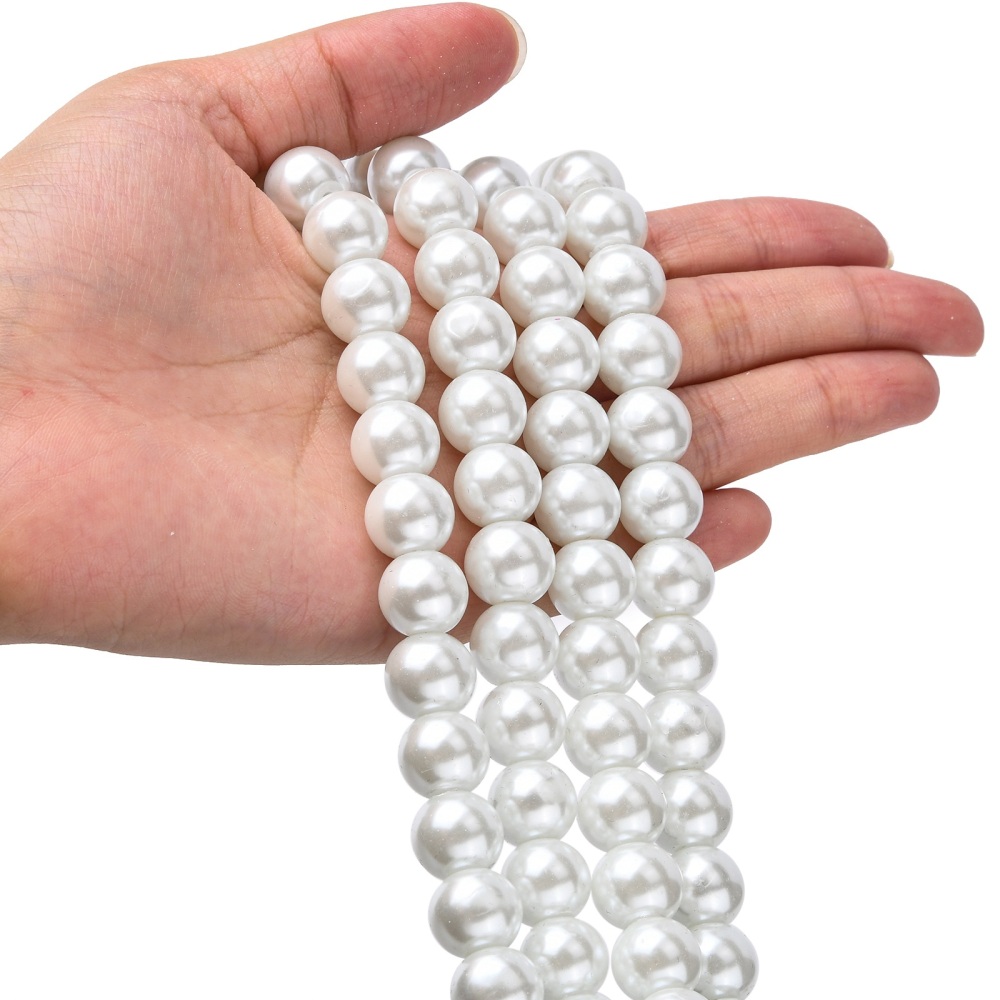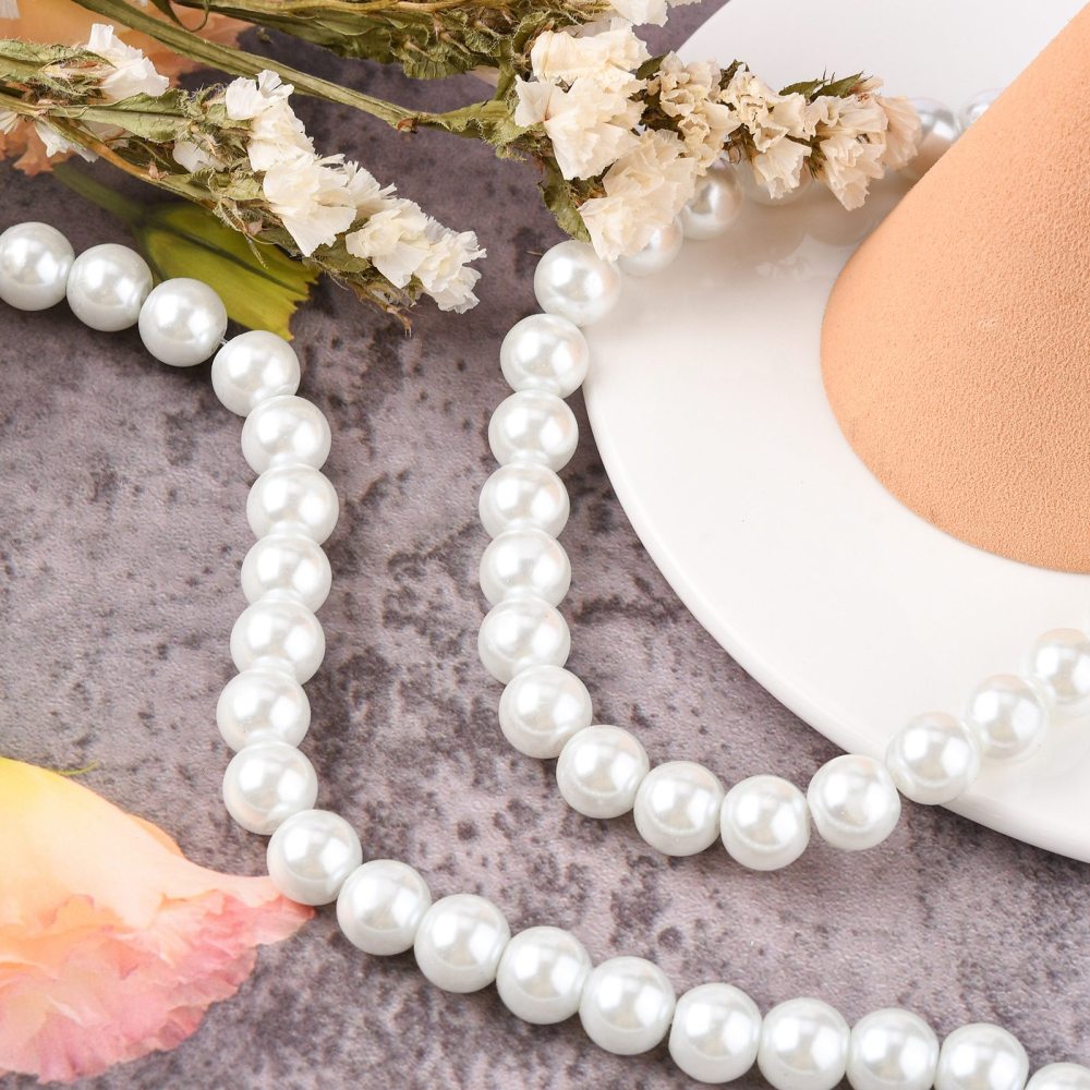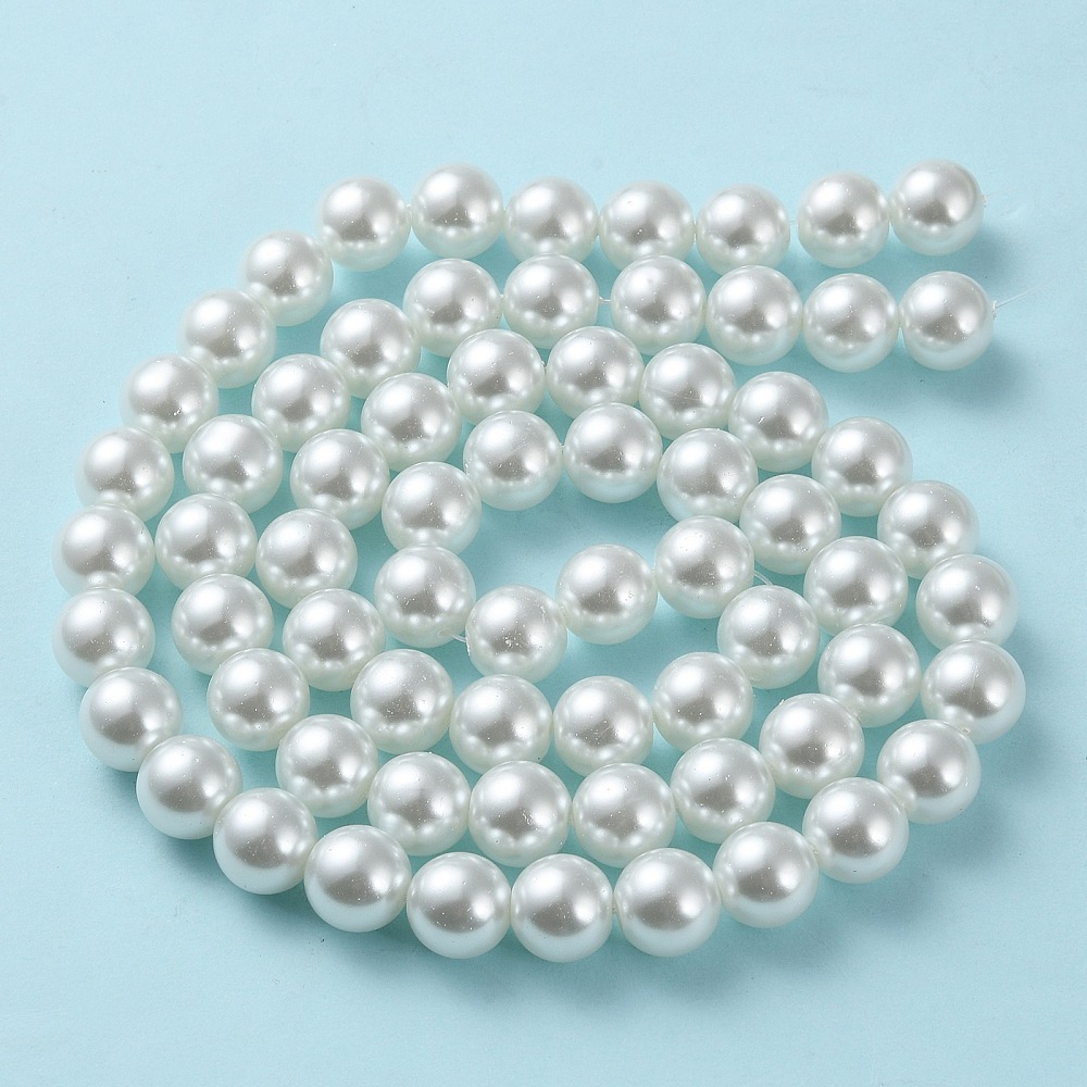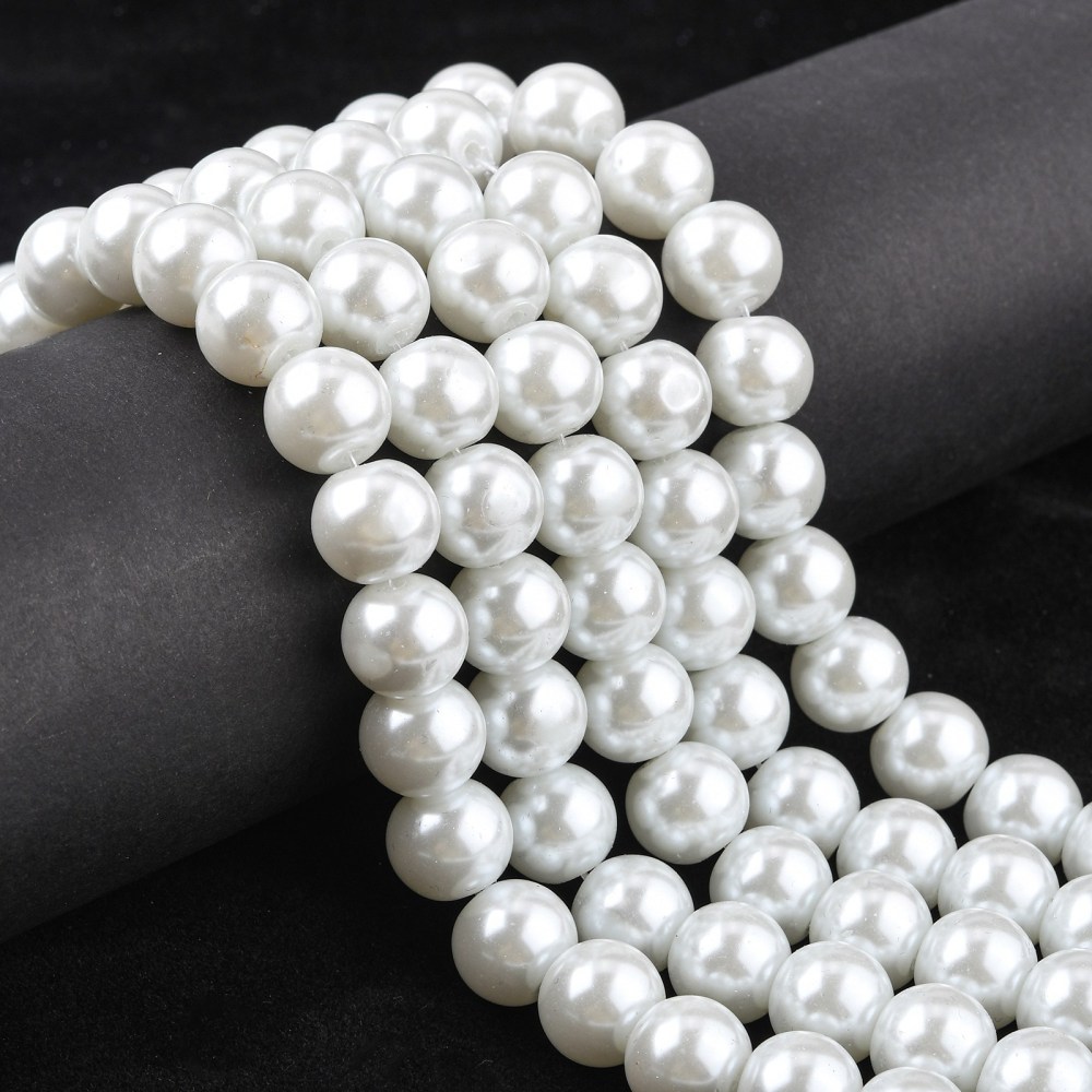 Стеклянные бусины с покрытием под жемчуг белого цвета. Бусины могут немного отличаться по форме и размеру, быть слегка приплюснутыми у отверстия. На покрытии есть мелкие неровности и царапинки. Оттенок может немного отличаться от представленного на фото. Цена за низку 80 см, около 70 шт.
