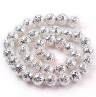Круглые каменные бусины из натуральной вулканической лавы (вулканического туфа), с гальваническим металлическим покрытием светло-серебристого цвета. Оттенок может отличаться от фотографии. Бусины могут немного отличаться по форме и размеру. Цена за низку 37 см (около 36 бусин, низки формируются без проверки каждой бусины на дефекты).