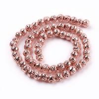 Круглые каменные бусины из натуральной вулканической лавы (вулканического туфа), с гальваническим металлическим покрытием цвета розового золота (яркой меди). Оттенок может отличаться от фотографии. Бусины могут немного отличаться по форме и размеру. Цена за низку 37 см (около 85 бусин, низки формируются без проверки каждой бусины на дефекты).