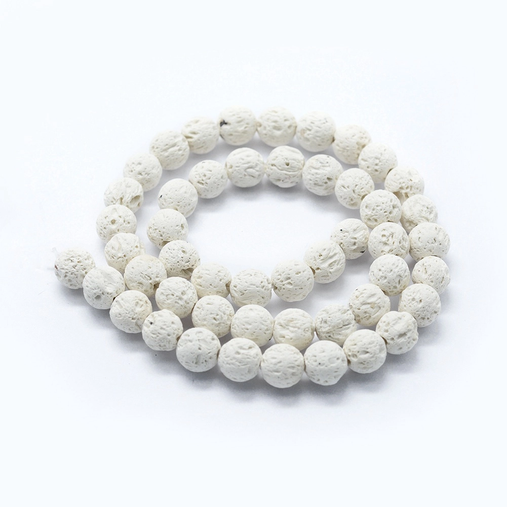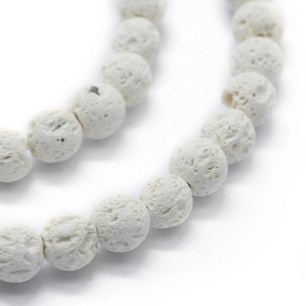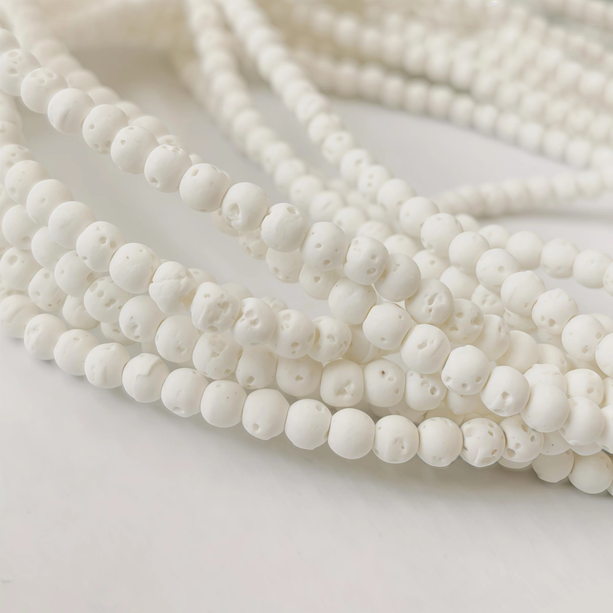 Бусины из измельчённой и спрессованной вулканической лавы (вулканического туфа), тонированной в белый цвет. На бусинах может быть виден шов, возможны неровности на поверхности. Оттенок может отличаться от фотографии и в разных поставках. Диаметр отверстия около 1 мм. Могут немного отличаться по форме и размеру. Бусины покрыты белой пылью от сверления, рекомендуется их протереть или промыть их перед использованием. Цена за низку, около 96 бусин. Низки формируются без проверки каждой бусины на дефекты.