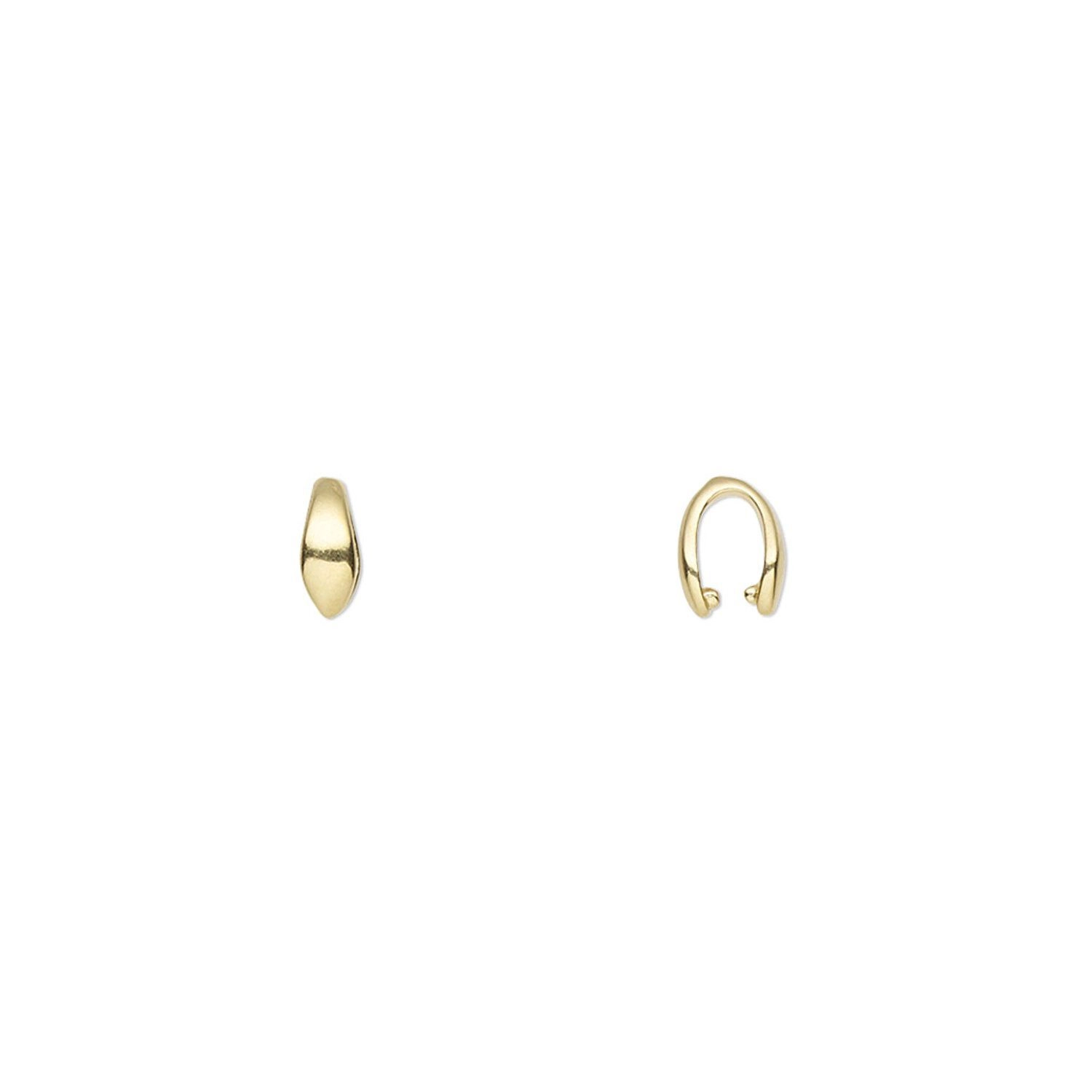 Покрытие золото 18К (карат). Лаконичный держатель для подвески (зажимной бейл). Подходит для бусин-бриолеток (бриолетов) и других бусин с поперечным отверстием сверху. Оттенок может отличаться от фотографии и в разных поставках. На месте изгиба возможны неровности, небольшие заусенцы. Цена за 5 шт.