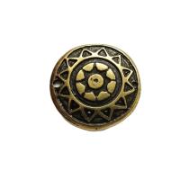 Односторонний декоративный элемент для создания украшений - выпуклый круг с орнаментом (Стилизованная звезда, Солнце) и двумя отверстиями, серия под старину - Историческая коллекция. Может также использоваться как соединительный элемент (коннектор) или подвеска. Диаметр отверстий - около 1.5 мм и 2 мм. Качественная фурнитура для бижутерии из сплава ZAMAK (ЦАМ). Покрытие - бронза с чернением, оттенок может отличаться от фотографии. Размер у разных элементов может отличаться от заявленного на +-1 мм. Цена за 1 шт.