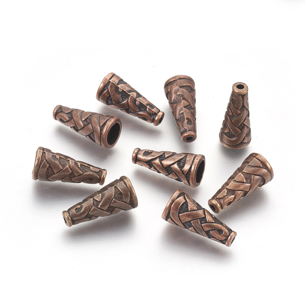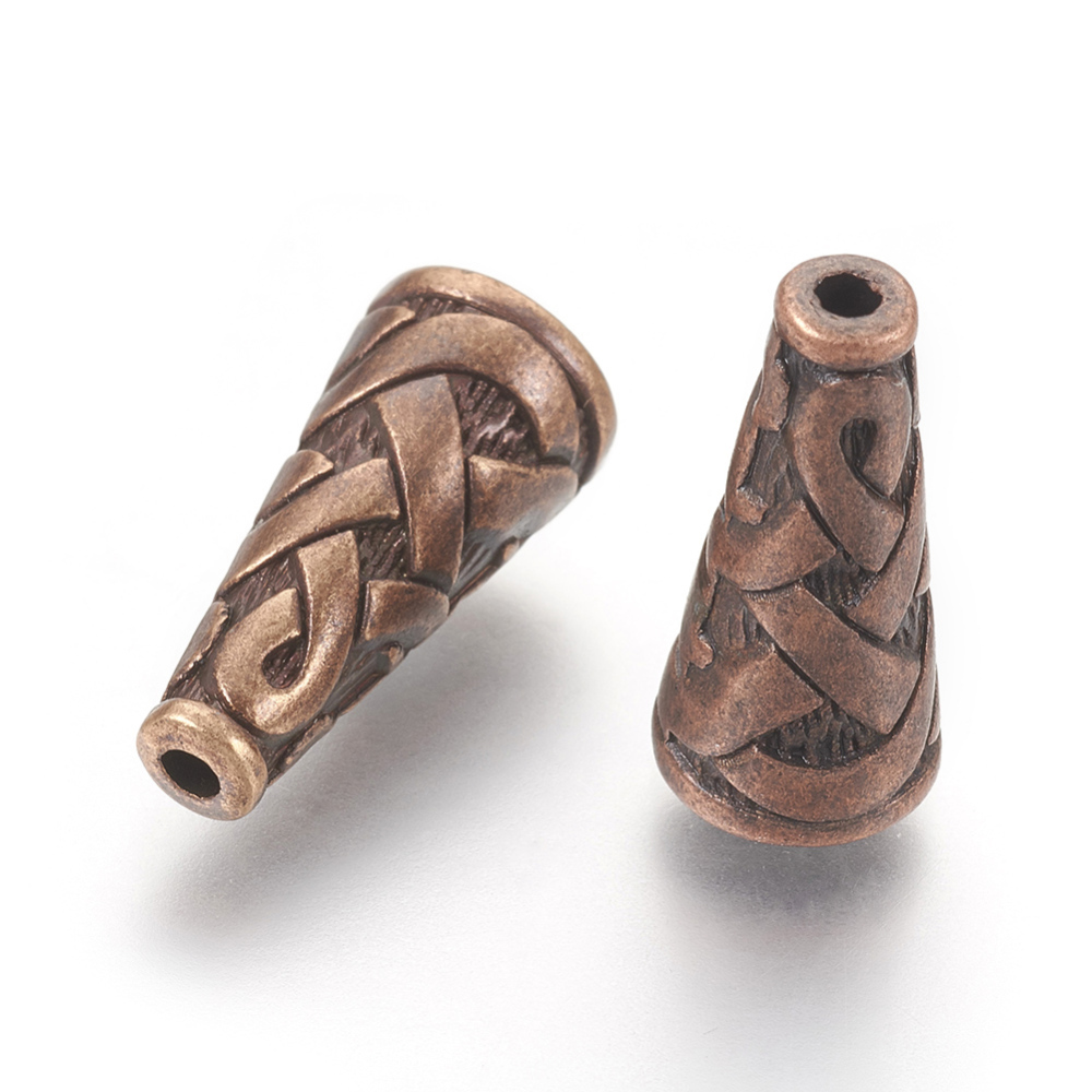 Конус с плетеным узором в кельтском стиле. Можно использовать как обниматель, концевик для кисточки или бисерных жгутов. Размер отверстия с одной стороны - около 6.7 мм, с другой - около 1.5 мм. Цвет медный, оттенок может отличаться от фотографии. Цена за 1 шт.
