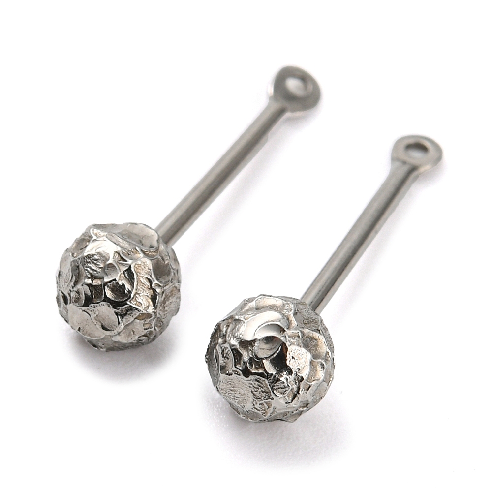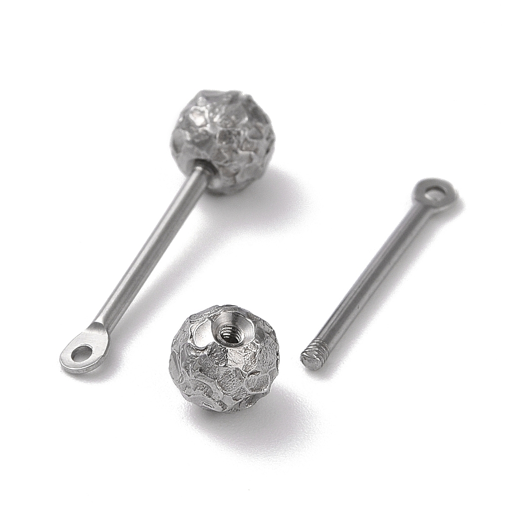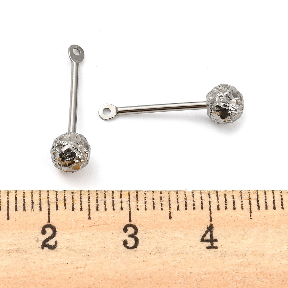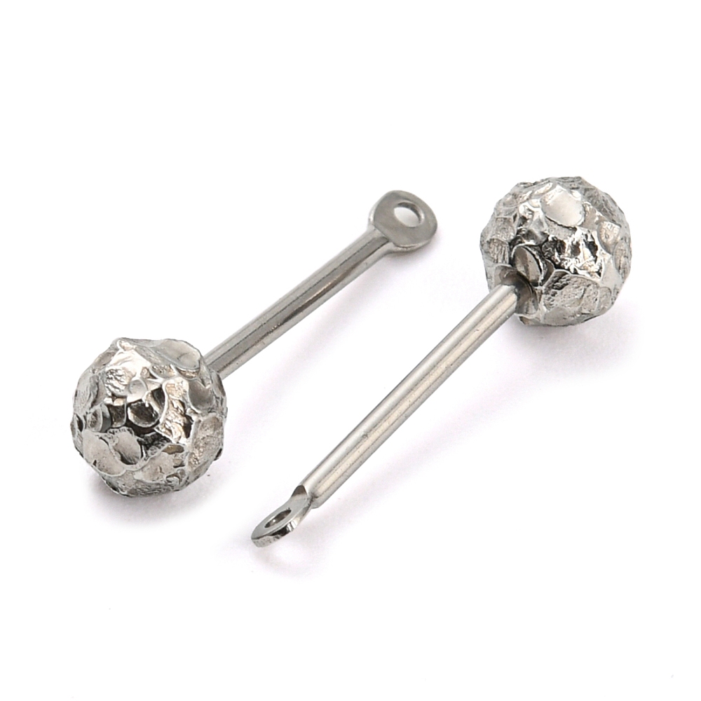 Основа - штанга для лэмпворка с фактурным шариком и петелькой. Шарик скручивается, по текстуре напоминает смятую фольгу или метеорит. На штифт можно надевать различные бусины, меняя их так часто, как захотите. Расстояние между петелькой и шариком 10-12 мм. Диаметр шарика - 5 мм. Диаметр штифта - 1.1 мм. Диаметр петельки - 2.3 мм. Общая длина - 19 мм. Размеры могут немного отличаться от заявленных. Базовый материал - нержавеющая сталь марок 304 (штифт) и 316 (бусина). Сталь этих марок используется в пищевой и медицинской промышленности: не темнеет, не облезает, гиполаллергенная. Оттенок может отличаться от фотографии и в разных поставках. Эти подвески-основы отлично подходят для создания серег, кулонов, брелоков. Цена за 2 шт.
