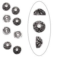 Шапочка (чашечка) для бусин с восточным орнаментом. Филигрань ручной работы. Можно использовать как обниматель для бусин или колпачок для бисерных жгутов. Внутренний диаметр с одной стороны - около 8 мм, со второй - около 1.7 мм. Хорошо подходит для украшений в стиле трайбл, бохо, этника. Базовый материал - белая латунь, покрытие - серебро 925 пробы. Производство - Индия. Цена за 5 шт.