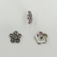 Изящная шапочка (чашечка) для бусин - цветочек с пятью лепестками и спиральным узором. Диаметр около 12 мм, диаметр отверстия - около 1 мм. Хорошо подходит для украшений в стиле трайбл, бохо, этника. Базовый материал - белая латунь, покрытие - серебро 925 пробы. Производство - Индия. Ручная работа. Цена за 5 шт.