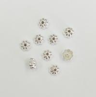 Изящный ребристый обниматель (шапочка, чашечка для бусин) в форме цветочка, ручная работа. Могут немного отличаться по форме и размеру. Внутренний диаметр - около 4 мм, диаметр отверстия - около 0.5 мм. Отверстие с изнаночной стороны сделано не очень аккуратно. Базовый материал - белая латунь, покрытие - серебро 925 пробы. Производство - Индия. Цена за 50 шт.