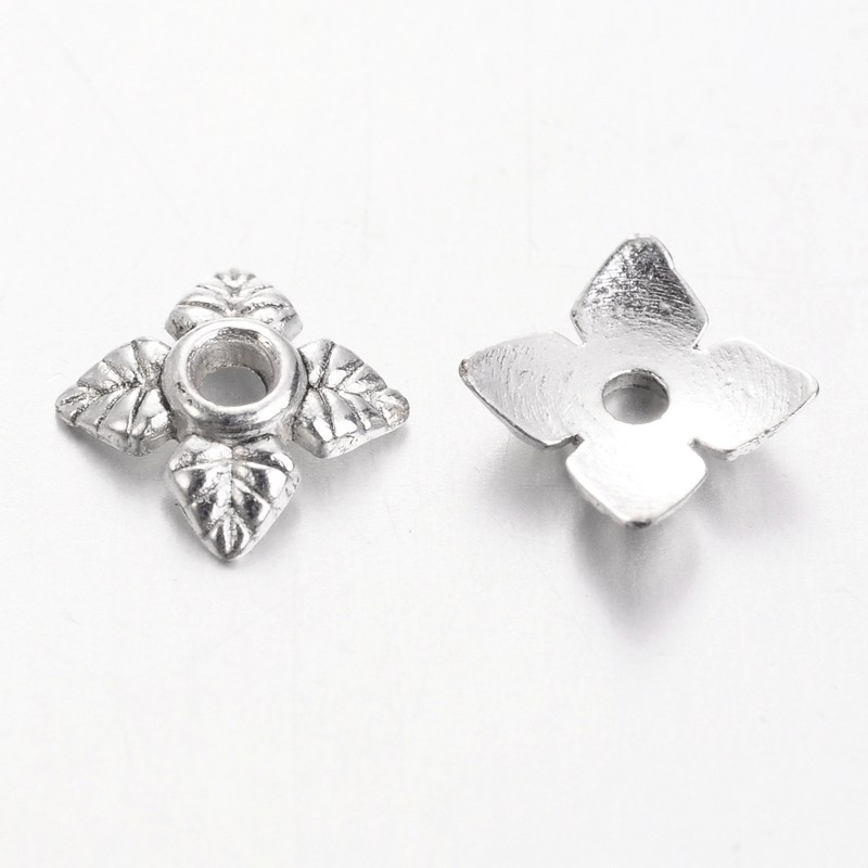 Маленький изящный обниматель (чашечка, шапочка) для бусин в форме четырех листиков. Под серебро с чернением. Оттенок может отличаться от фотографии. Цена за 5 грамм (около 40 шт, фасуются на вес без проверки на дефекты).