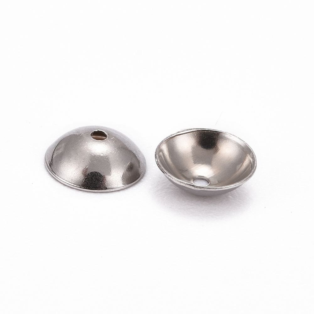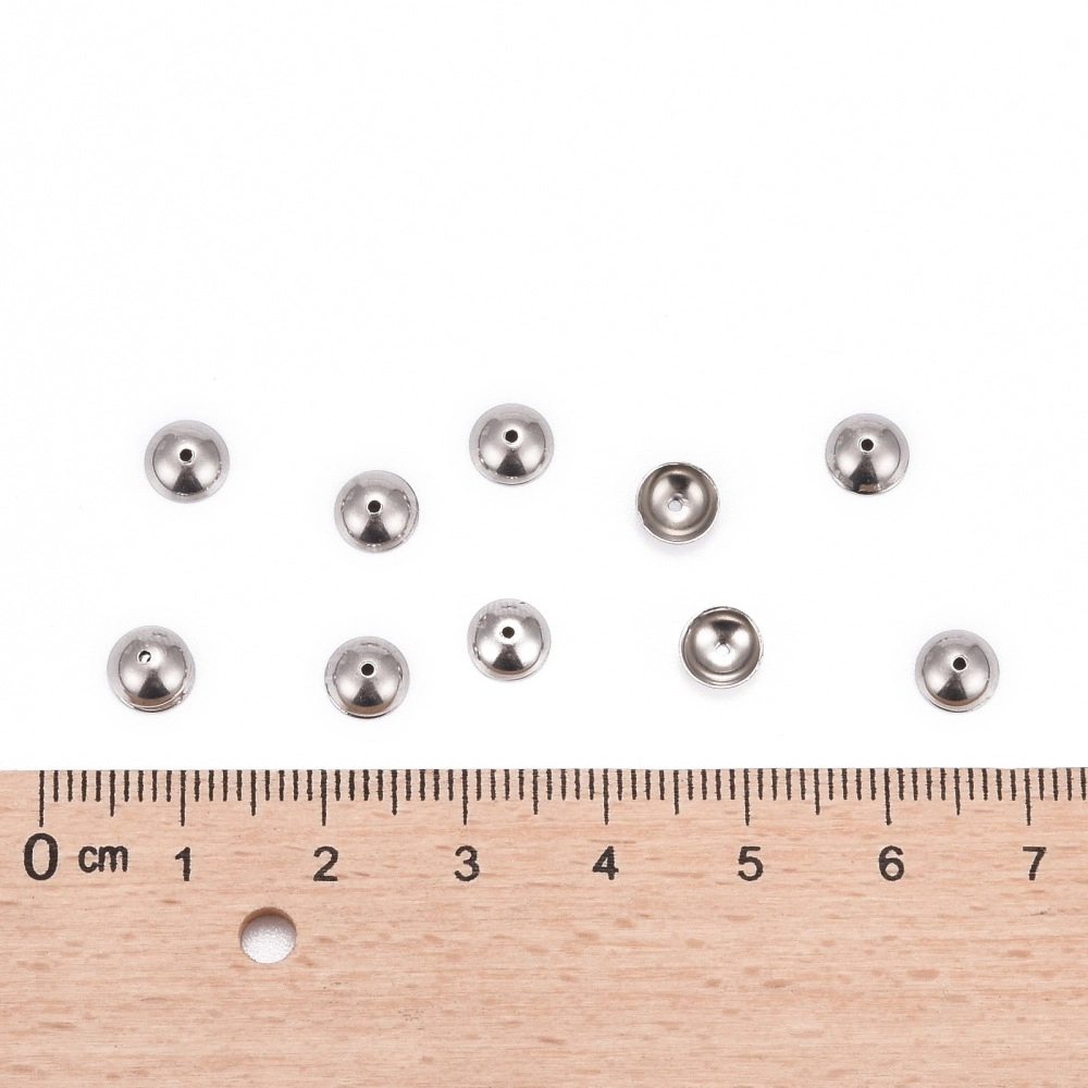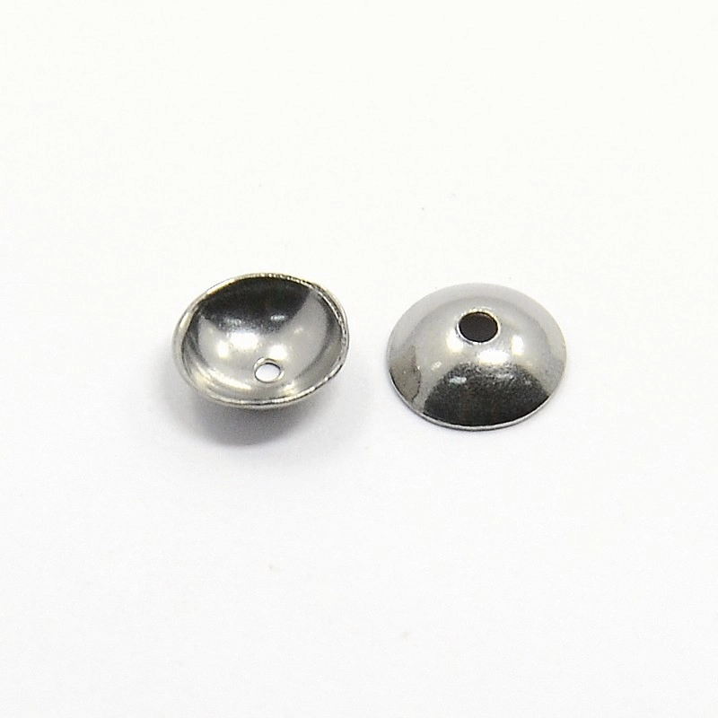 Лаконичные обниматели (шапочки, чашечки) для бусин в форме выпуклого круга, гладкие. Отлично подходят для украшений в стиле Шанель. Фурнитура для бижутерии из нержавеющей стали (марка 304: используется в пищевой промышленности, не окисляется, не темнеет, не облезает, гипоаллергенная). Оттенок может отличаться от фотографии и в разных поставках. Размер отверстий может отличаться у разных обнимателей. Цена за 50 шт.