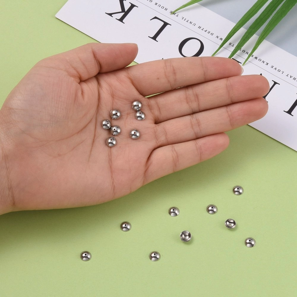 Лаконичный обниматель (шапочка, чашечка) для бусин в форме выпуклого диска, гладкий. Фурнитура для бижутерии из нержавеющей стали (марка 304: используется в пищевой промышленности, не темнеет, не облезает, гипоаллергенная). Оттенок может отличаться от фотографии и в разных поставках. Размер отверстий может отличаться у разных обнимателей. Цена за 50 шт.
