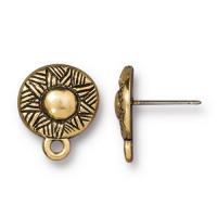 Качественные основы для серег-гвоздиков (пуссеты) с декоративной платформой в этническом индейском стиле (ETHNIC) и петелькой. Узор также напоминает стилизованное солнце или подсолнух. Продаются без застежек. Базовый материал - бижутерный сплав на основе олова. Покрытие - позолота с чернением, оттенок может отличаться от фотографии и в разных поставках. Производство Тьерра Каст (Tierra Cast, США). у. Артикул производителя: 94-1081-26. Цена за пару.