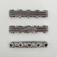 Крупный эффектный разделитель рядов для многорядных украшений (браслетов, колье), декорированный тремя косичками. На пять нитей, двусторонний, с одной стороны есть шов. Разделитель подходит для бусин до 9 мм включительно (расстояние между центрами отверстий составляет около 9 мм). Диаметр отверстий около 2 мм. Между основными отверстиями имеются зазоры, в которые также можно провести нити. В этом случае разделитель может использовать для девяти рядов бусин диаметром до 4 мм. Базовый материал - белая латунь, покрытие - серебро 925 пробы. Производство - Индия. Ручная работа. Цена за 1 шт.