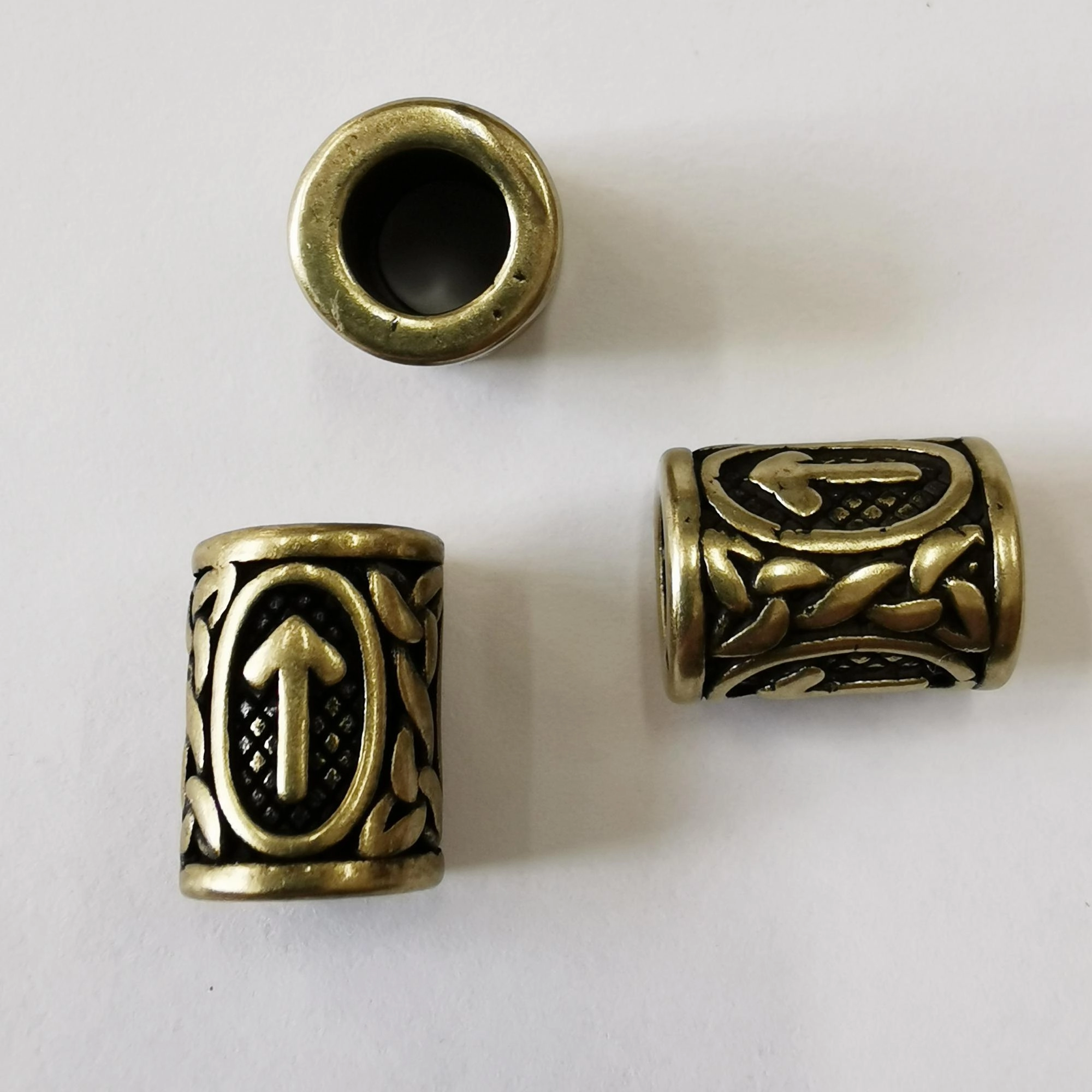 Массивная металлическая бусина - трубочка с изображением скандинавской руны из старшего футарка. Руна ᛏ (Тейваз, Тиваз, Тур, Тир, Тюр), символизирует воинскую доблесть, мужество и справедливость. Нержавеющая гипоаллергенная сталь (марка 304: используется в пищевой промышленности, не окисляется) с покрытием под светлую бронзу с золотистым отливом. Оттенок может отличаться от фотографии и в разных поставках. Отверстие около 6 мм. На бусинах возможны небольшие щербинки, рисунок может быть не очень чёткий. Цена за 1 шт.