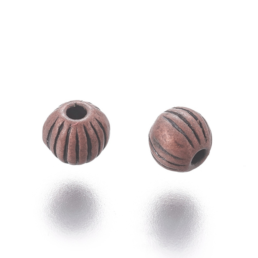 Бусина - разделитель (спейсер) шарик с бороздками, под медь с чернением. Оттенок может отличаться от фотографии. Диаметр отверстия около 1 мм. Цена за упаковку 10 грамм (около 65 бусин).