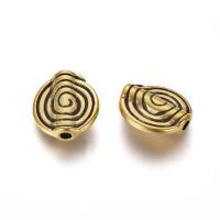 Плоская, слегка изогнутая бусина в форме спирали. Изготовлена из бижутерного сплава с золотистым покрытием с чернением. Оттенок может отличаться от фотографии и в разных поставках. Размер отверстия около 1.2 мм. Цена за 10 грамм (около 12 штук, фасуются без проверки на дефекты).