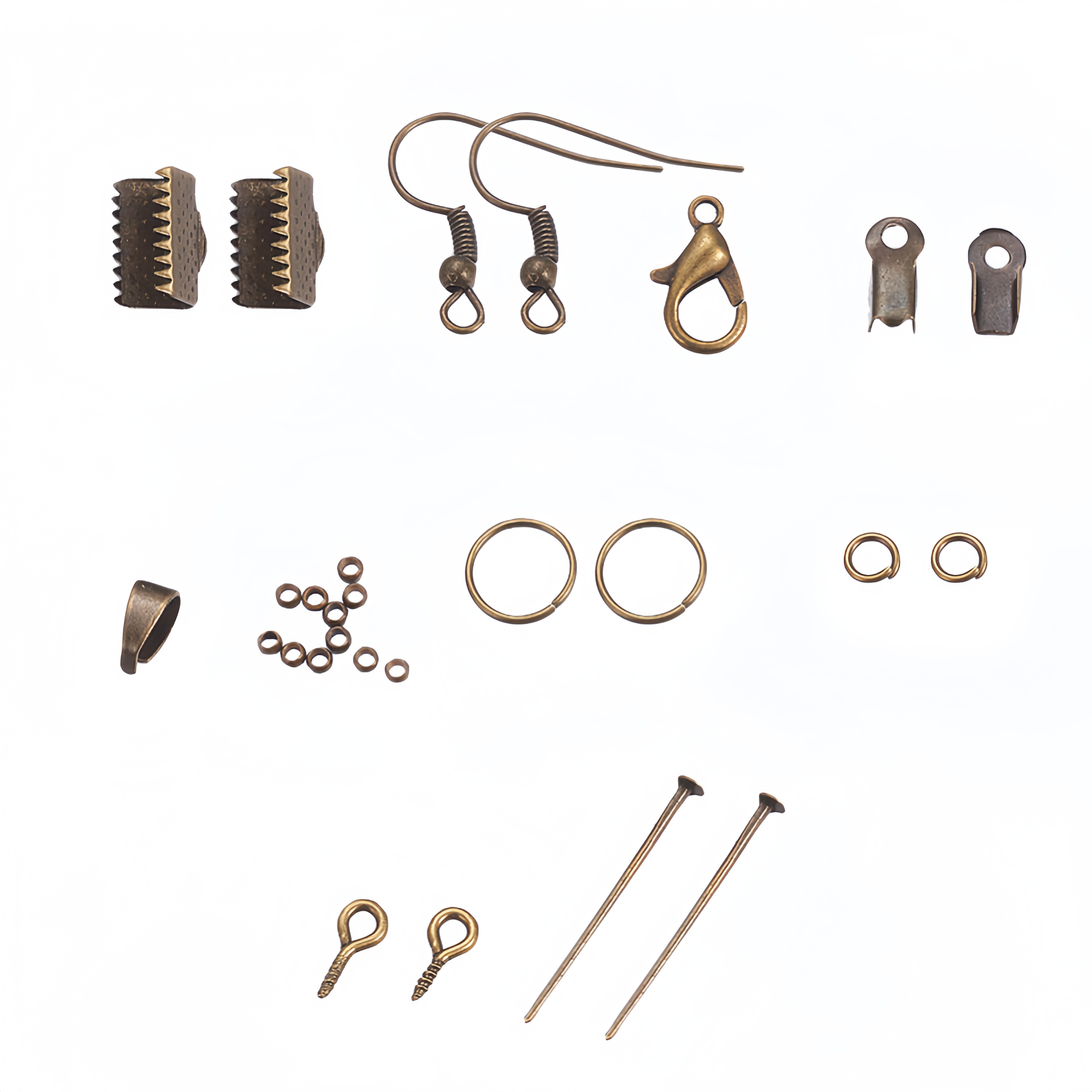 Набор фурнитуры бронзового цвета для создания украшений (бижутерии). Оттенок может отличаться от фотографии и в разных поставках. Внутри коробочки может попадаться шелуха овса, используемая для абсорбции лишней влаги. В набор входит: