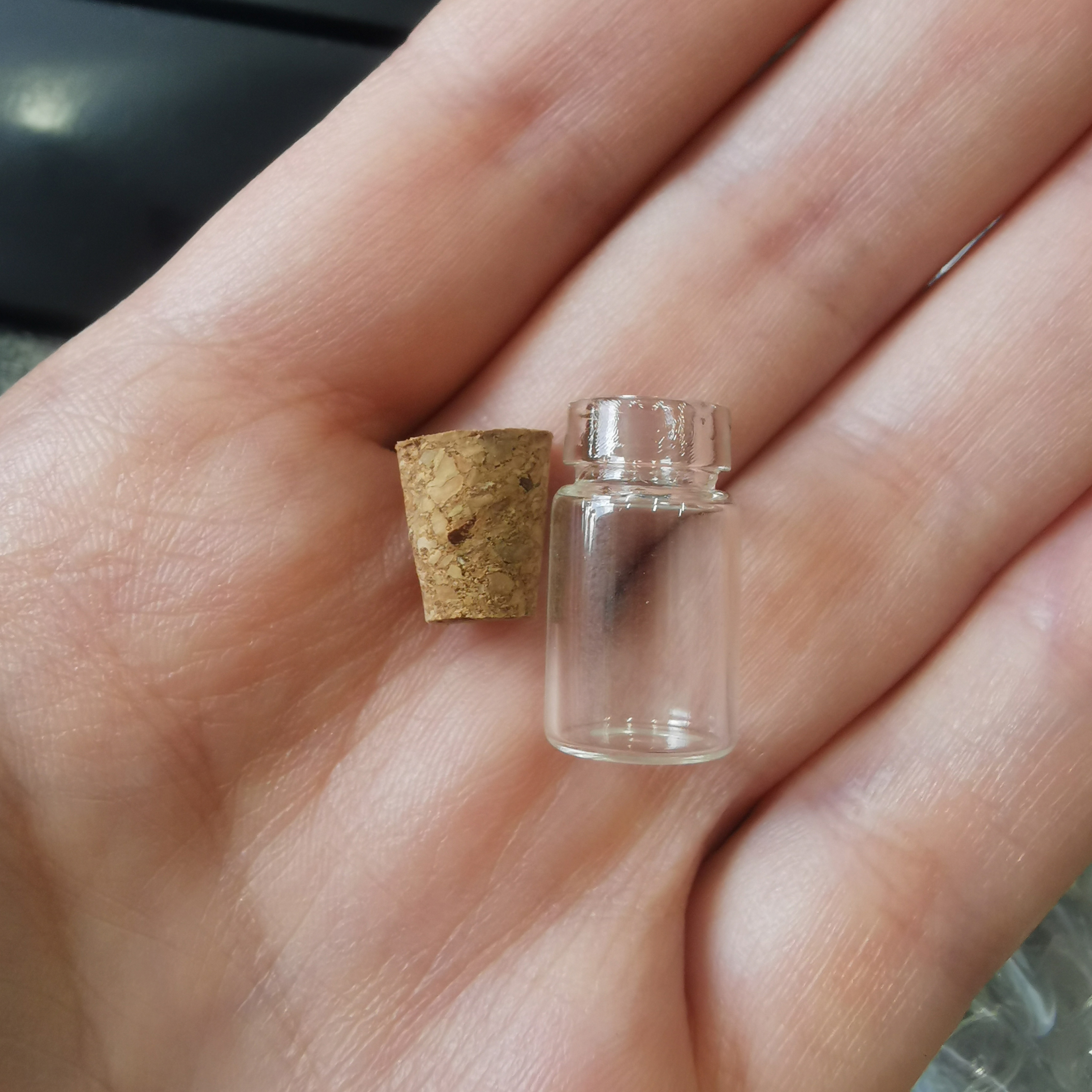 ВНИМАНИЕ: в последней поставке пробка крупная, с трудом вставляется в бутылочку - может потребоваться подрезка канцелярским ножом. Стеклянная мини-бутылочка с пробкой. Размер баночки 18*10 мм, внутренний диаметр горлышка около 5 мм. Внутренний объем - 1.5 мл. Отлично подходит для кукольных миниатюр, для сережек, кулонов, брелоков. Просто насыпьте в бутылочку песок или мелкий бисер, и украшение готово! Цена за 1 шт.