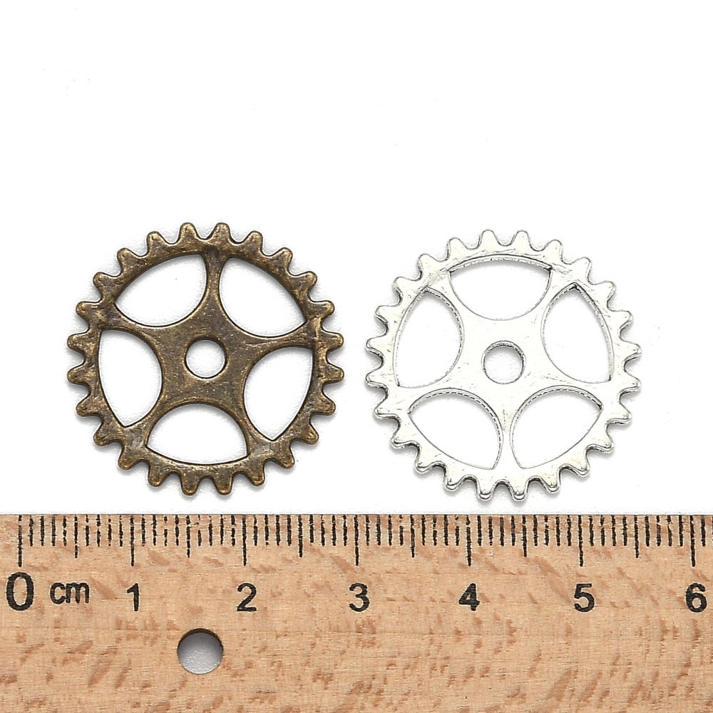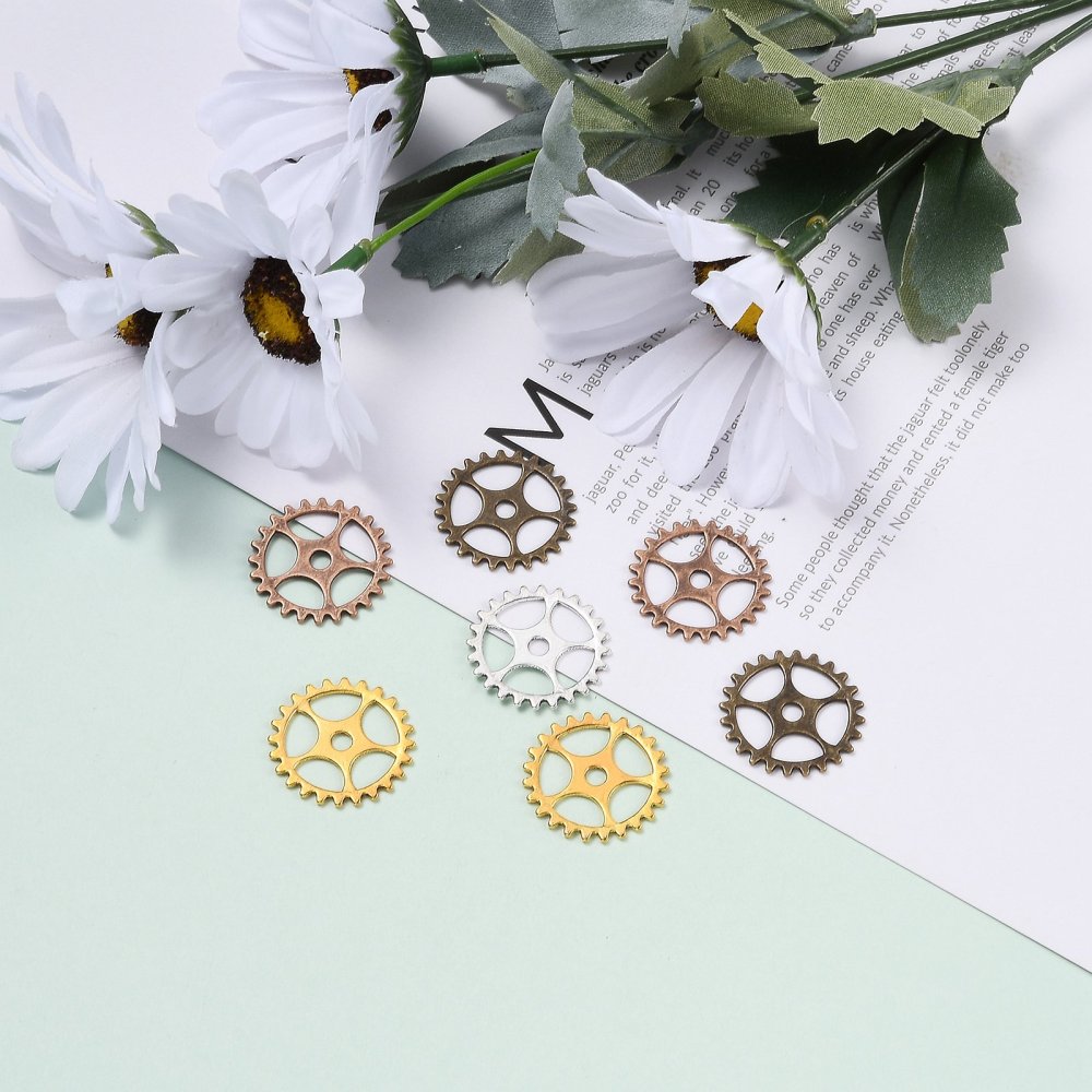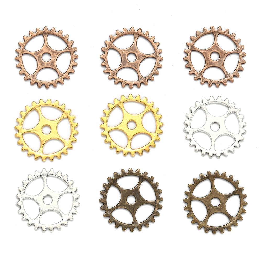 Набор декоративных элементов - шестеренок из металлического сплава толщиной около 1 мм. Эти шестеренки могут также использоваться как подвески, коннекторы или элементы под заклепку. Отлично подойдут для украшений в стиле стимпанк (steampunk). Возможные цвета: золото, бронза, медь, тибетское серебро. Оттенок может отличаться от фотографии и в разных поставках. Цена за 20 штук случайного цвета.
