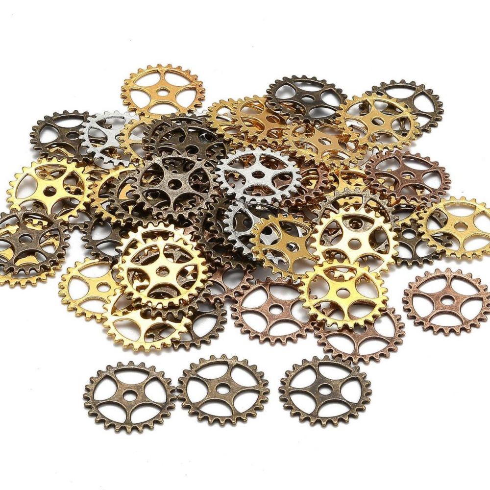 Набор декоративных элементов - шестеренок из металлического сплава. Эти шестеренки могут также использоваться как подвески или соединительные элементы. Отлично подойдут для украшений в стиле стимпанк (steampunk). Возможные цвета: золото, бронза, медь, тибетское серебро. Оттенок может отличаться от фотографии и в разных поставках. Цена за 20 шестерёнок случайного цвета.