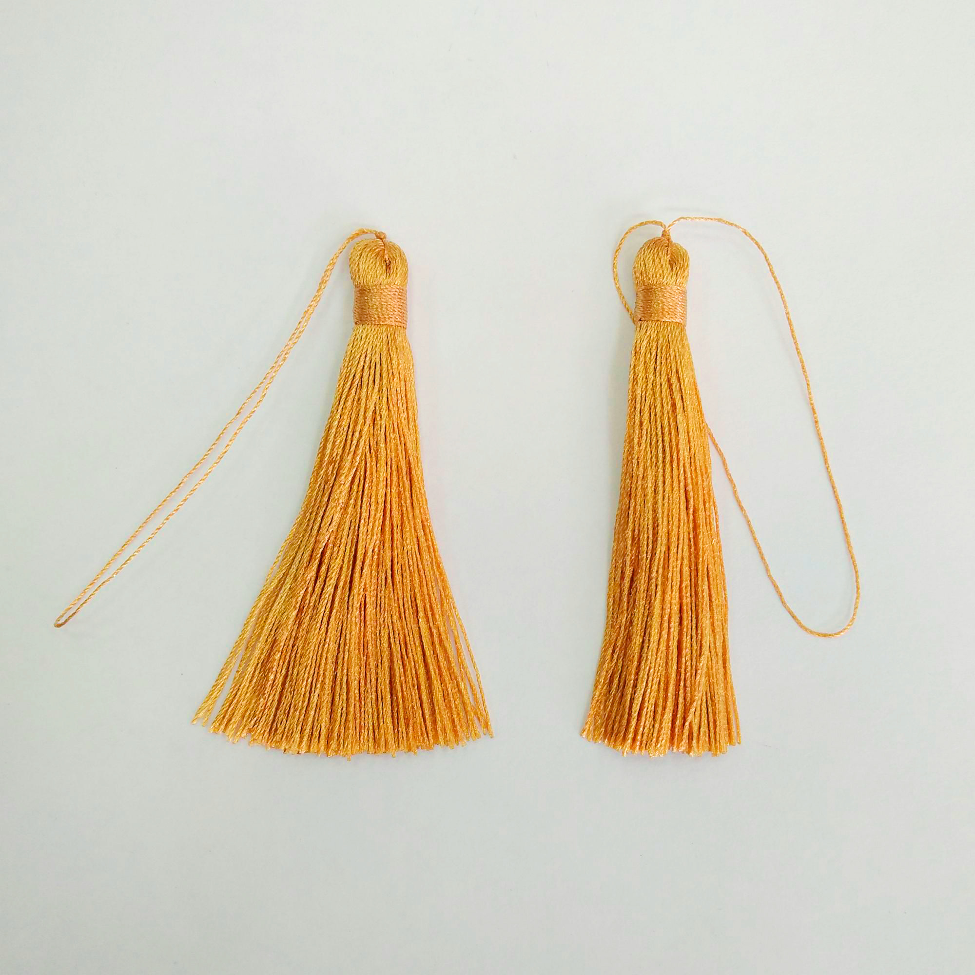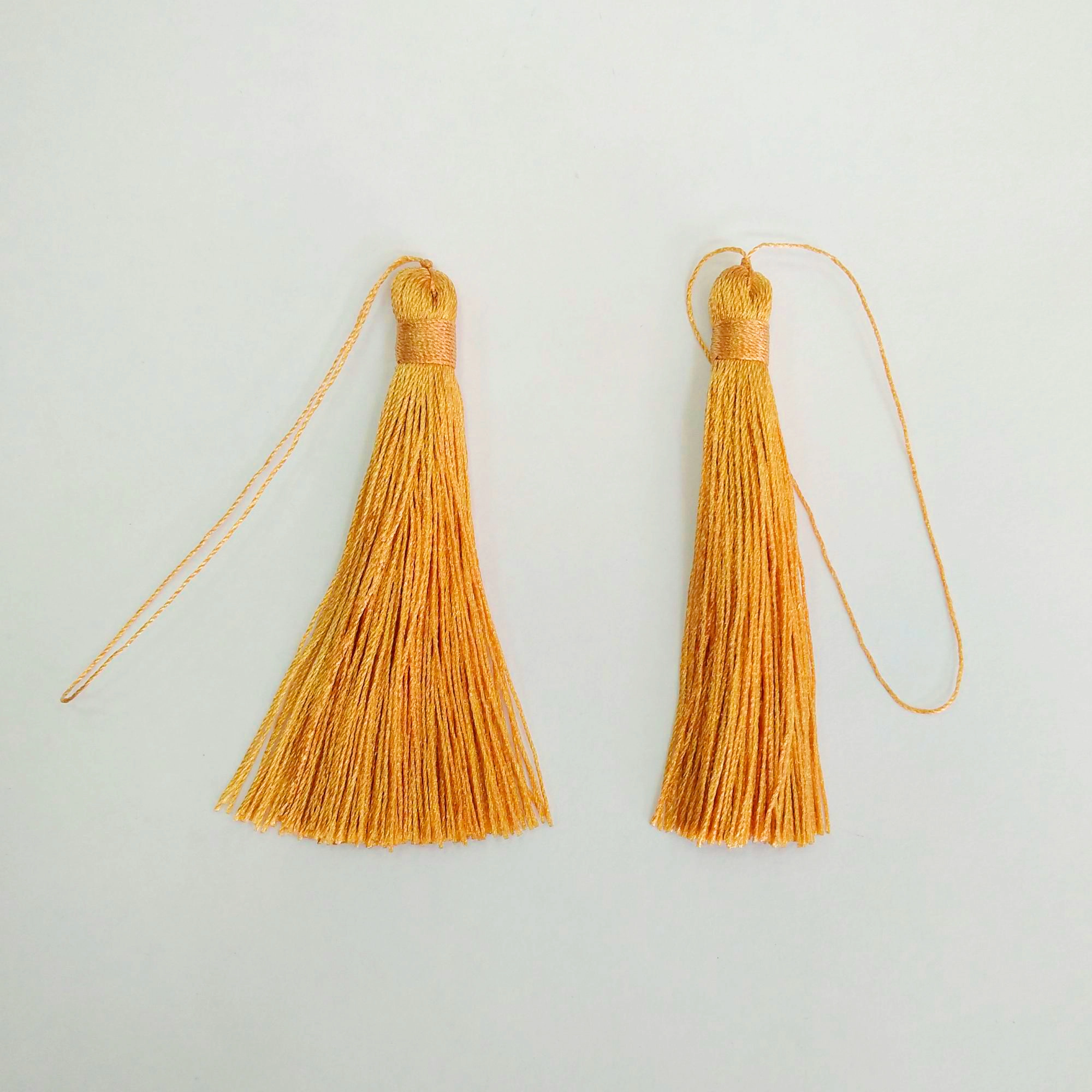 Небольшая изящная нейлоновая кисточка с длинной петелькой. Используется для создания бижутерии: сережек, кулонов (сотуаров), подвесок на сумки и брелоки, других украшений. Ширина кисточки около 6 мм, длина кисточки - около 6 см без петельки, длина петельки - около 5 см. Размер может немного отличаться от заявленного. Кисть желто-оранжевая. Оттенок может немного отличаться от представленного на фотографии. Цена за 2 шт.