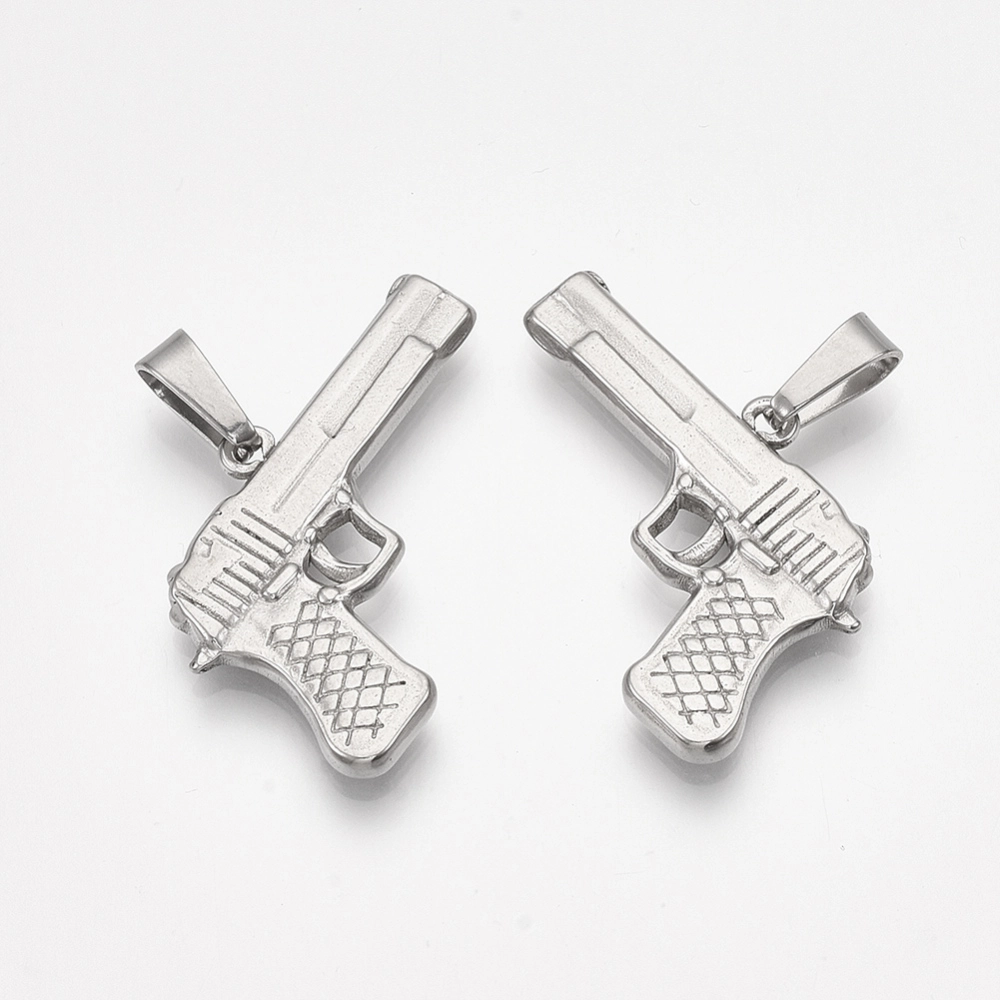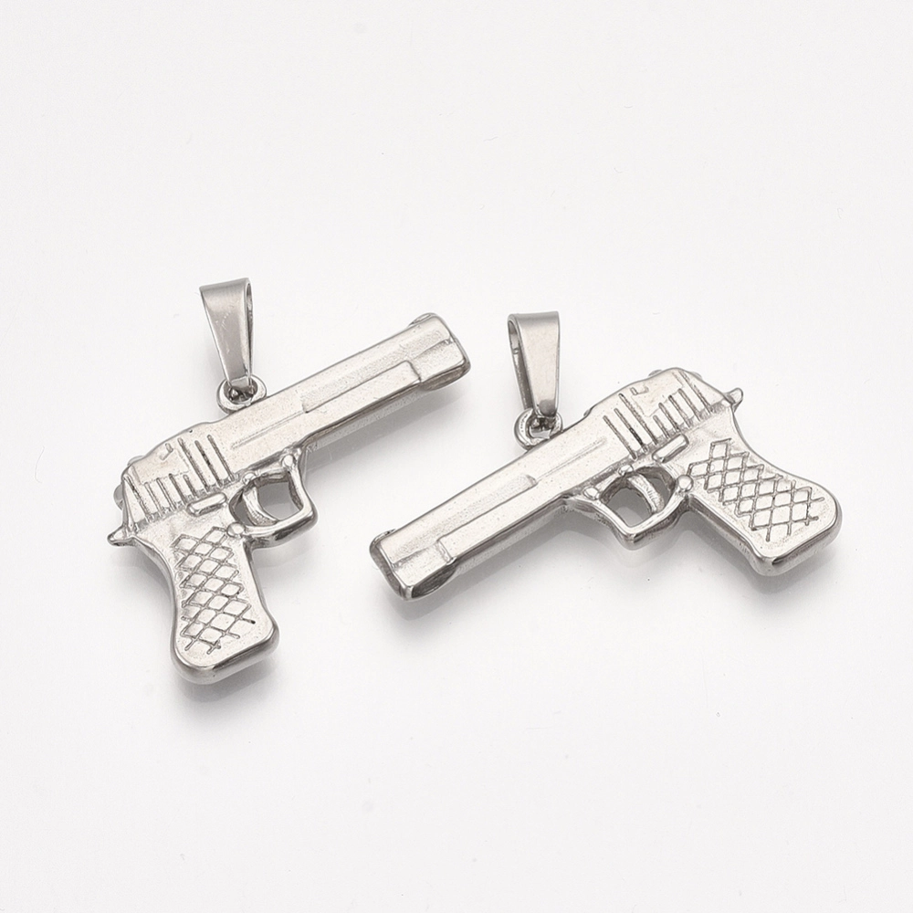 Не темнеющая фурнитура из нержавейки. Трехмерная подвеска в форме пистолета из нержавеющей стали марки 304 (используется в пищевой и медицинской промышленности, не боится влаги, не окисляется, не темнеет, не облезает). Оттенок может отличаться от фотографии и в разных поставках. Размер самого пистолета 30*23*3мм. К подвеске прикреплён разъёмный держатель (бейл) размером 9*5*4мм, при желании его можно убрать. Цена за 1 шт.