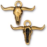 Эффектная трёхмерная металлическая подвеска – череп буйвола (быка). Дизайн Longhorn (буйволиный череп с длинными рогами). Базовый материал - пьютер (бижутерный металлический сплав на основе олова). Покрытие - гальваническое напыление золотом 22 карата с чернением. Оттенок может отличаться от фотографии и в разных поставках. Качественная брендовая американская фурнитура компании Tierra Cast (Тьерра Каст, США). Артикул производителя: 94-2576-26. Цена за 1 шт.