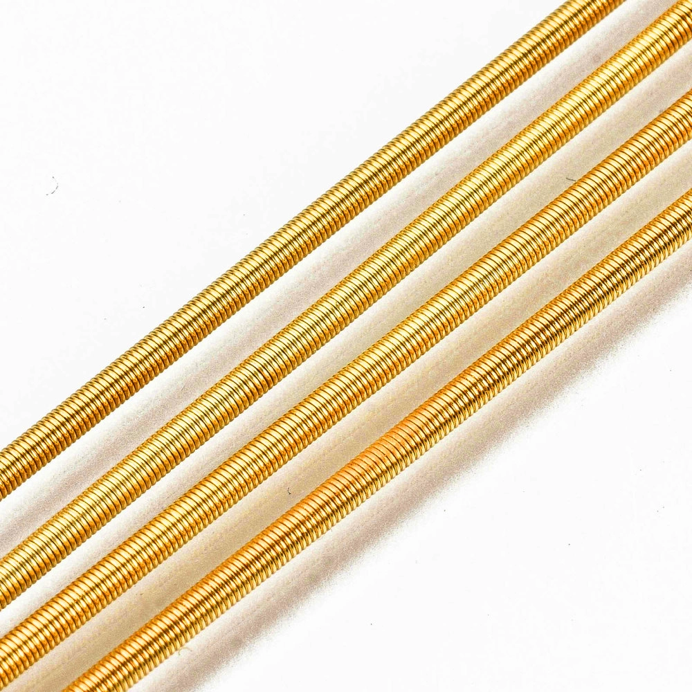 Гладкая золотистая проволока-пружинка типа бульонка - канитель. Тип: жёсткая. Базовый материал - сталь. Толщина, заявленная производителем - 2 мм, может немного отличаться в разных поставках. Длина около 95-99 см (канитель нарезана производителем). На проволоке могут периодически встречаться заломы/растянутые участки, тёмные пятнышки. Цвет яркое золото, оттенок может отличаться от фотографии и в разных поставках. Цена за 1 кусочек (95 см).