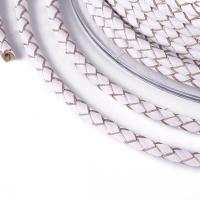Плетеный кожаный шнур. Сплетён из плоского белого шнура с бежево-коричневым срезом, за счёт чего при плетении получается красивый графичный узор. Очень аккуратный. Отлично подойдет для создания браслетов и украшений на шею. Выполнен из натуральной восстановленной кожи. Толщина может немного отличаться от заявленной. Цена за 1 метр. При покупке нескольких единиц отрезается цельным куском.