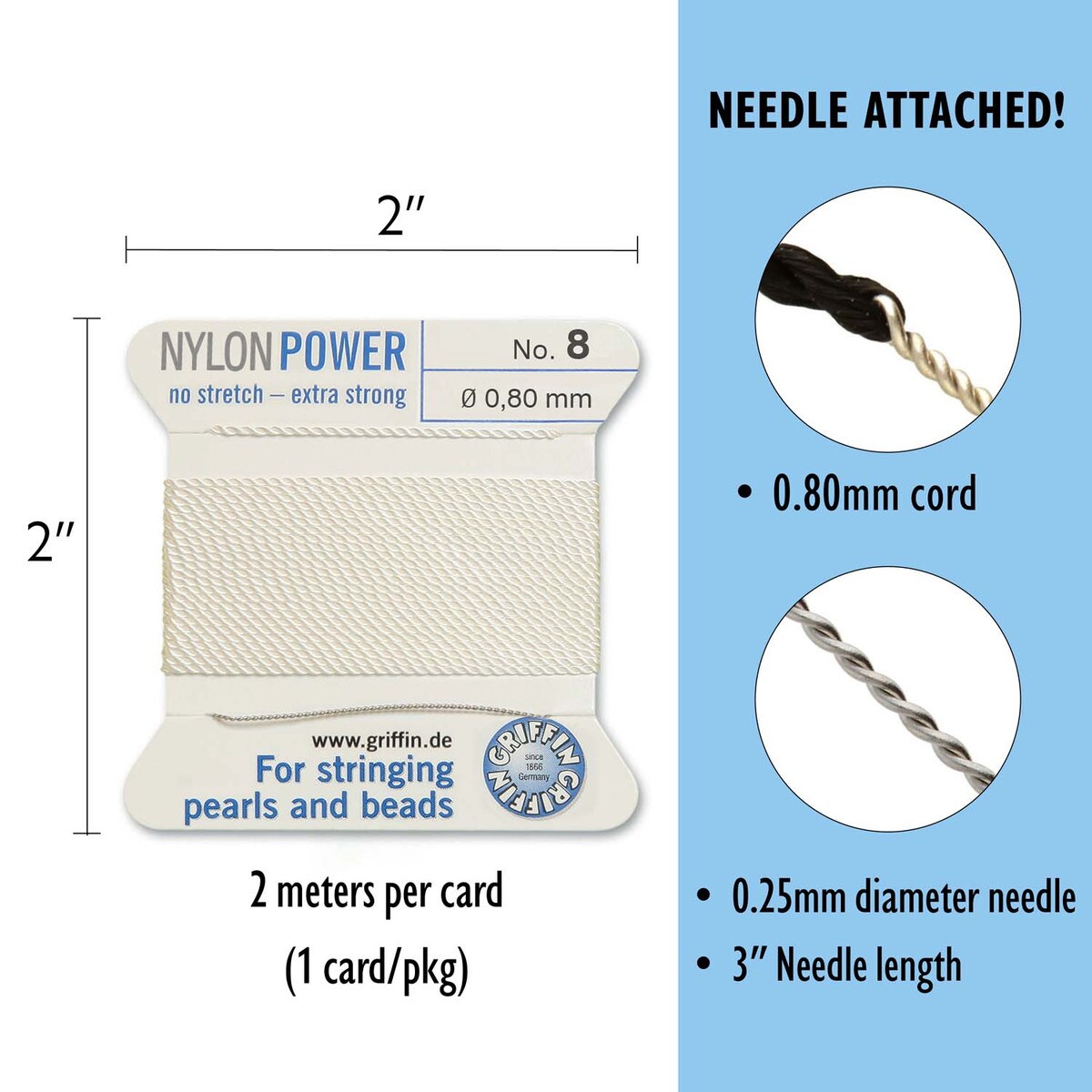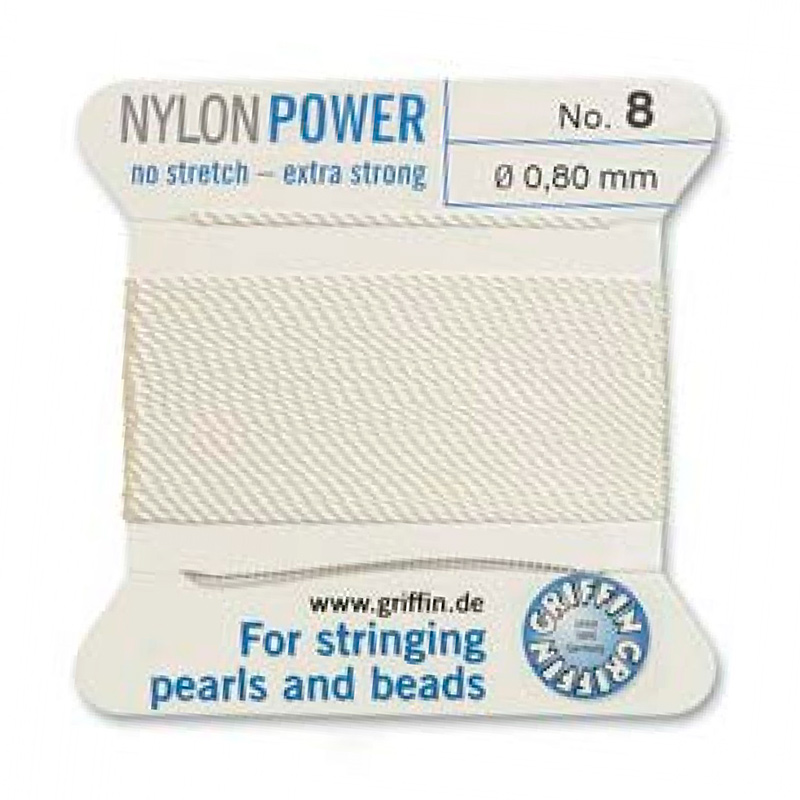 Толстая и прочная нейлоновая нить NylonPower для низания бус. Нить крученая, напоминает шнур-змейку. Изготовлена из высококачественного нейлона, очень крепкая, не вытягивается. Произведена немецкой компанией Griffin в Германии. К нити прикреплена стальная скрученная проволочка-иголка для нанизывания бусин. Идеально подходит для использования с жемчугом и натуральными камнями. Цвет молочно-белый (white). Оттенок может немного отличаться от фотографии. Толщина около 0,8 мм. Намотка может состоять из нескольких частей. Цена за моток 2 метра.