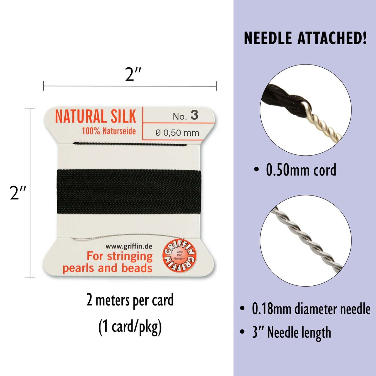 Прочная шелковая нить для низания бус и браслетов. Изготовлена из высококачественного натурального 100% шелка, произведена немецкой компанией Griffin. К нити прикреплена стальная скрученная проволочка-иголка для нанизывания бусин. Идеально подходит для использования с жемчугом и натуральными камнями. Цвет чёрный (black). Оттенок нити может немного отличаться от фотографии. Дизайн упаковки может отличаться от фотографии. Толщина около 0,5 мм (размер No.3). Цена за моток 2 метра.