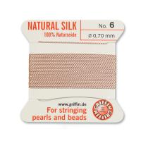 Прочная шелковая нить средней толщины для низания бус. Изготовлена из высококачественного натурального 100% шелка, произведена немецкой компанией Griffin. К нити прикреплена стальная скрученная проволочка-иголка для нанизывания бусин. Идеально подходит для использования с жемчугом и натуральными камнями. Цвет бледный персиково-бежевый (light pink). Оттенок может немного отличаться от фотографии. Толщина около 0,7 мм. Цена за моток 2 метра.