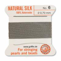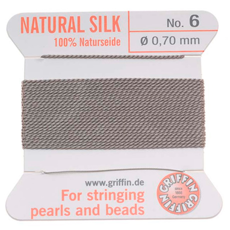 Прочная шелковая нить средней толщины для низания бус. Изготовлена из высококачественного натурального 100% шелка, произведена немецкой компанией Griffin. К нити прикреплена стальная скрученная проволочка-иголка для нанизывания бусин. Идеально подходит для использования с жемчугом и натуральными камнями. Цвет серый (grey). Оттенок может немного отличаться от фотографии. Толщина около 0,7 мм. Цена за моток 2 метра.