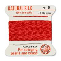 Толстая и прочная шелковая нить для низания бус. Изготовлена из высококачественного натурального 100% шелка, произведена немецкой компанией Griffin. К нити прикреплена стальная скрученная проволочка-иголка для нанизывания бусин. Идеально подходит для использования с жемчугом и натуральными камнями. Цвет красный (red). Оттенок может немного отличаться от фотографии. Толщина около 0,8 мм. Цена за моток 2 метра.