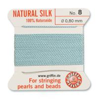 Толстая и прочная шелковая нить для низания бус. Изготовлена из высококачественного натурального 100% шелка, произведена немецкой компанией Griffin. К нити прикреплена стальная скрученная проволочка-иголка для нанизывания бусин. Идеально подходит для использования с жемчугом и натуральными камнями. Цвет бирюзово-голубой (turquoise). Оттенок может немного отличаться от фотографии. Толщина около 0,8 мм. Цена за моток 2 метра.