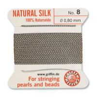 Толстая и прочная шелковая нить для низания бус. Изготовлена из высококачественного натурального 100% шелка, произведена немецкой компанией Griffin. К нити прикреплена стальная скрученная проволочка-иголка для нанизывания бусин. Идеально подходит для использования с жемчугом и натуральными камнями. Цвет серый (grey). Оттенок может немного отличаться от фотографии. Толщина около 0,8 мм. Цена за моток 2 метра.