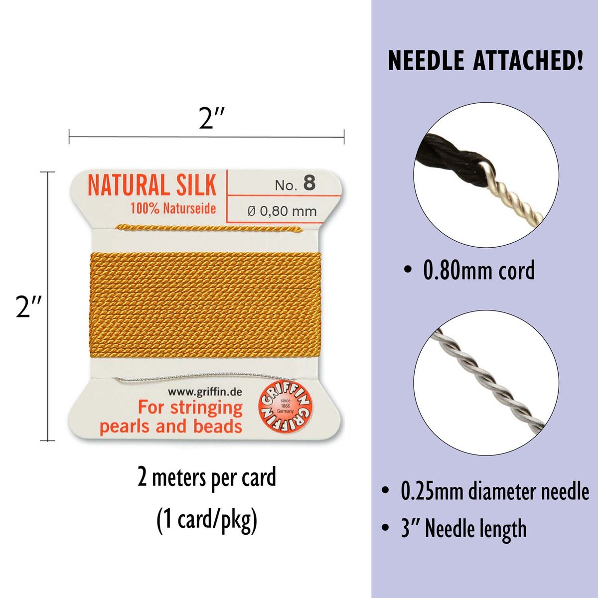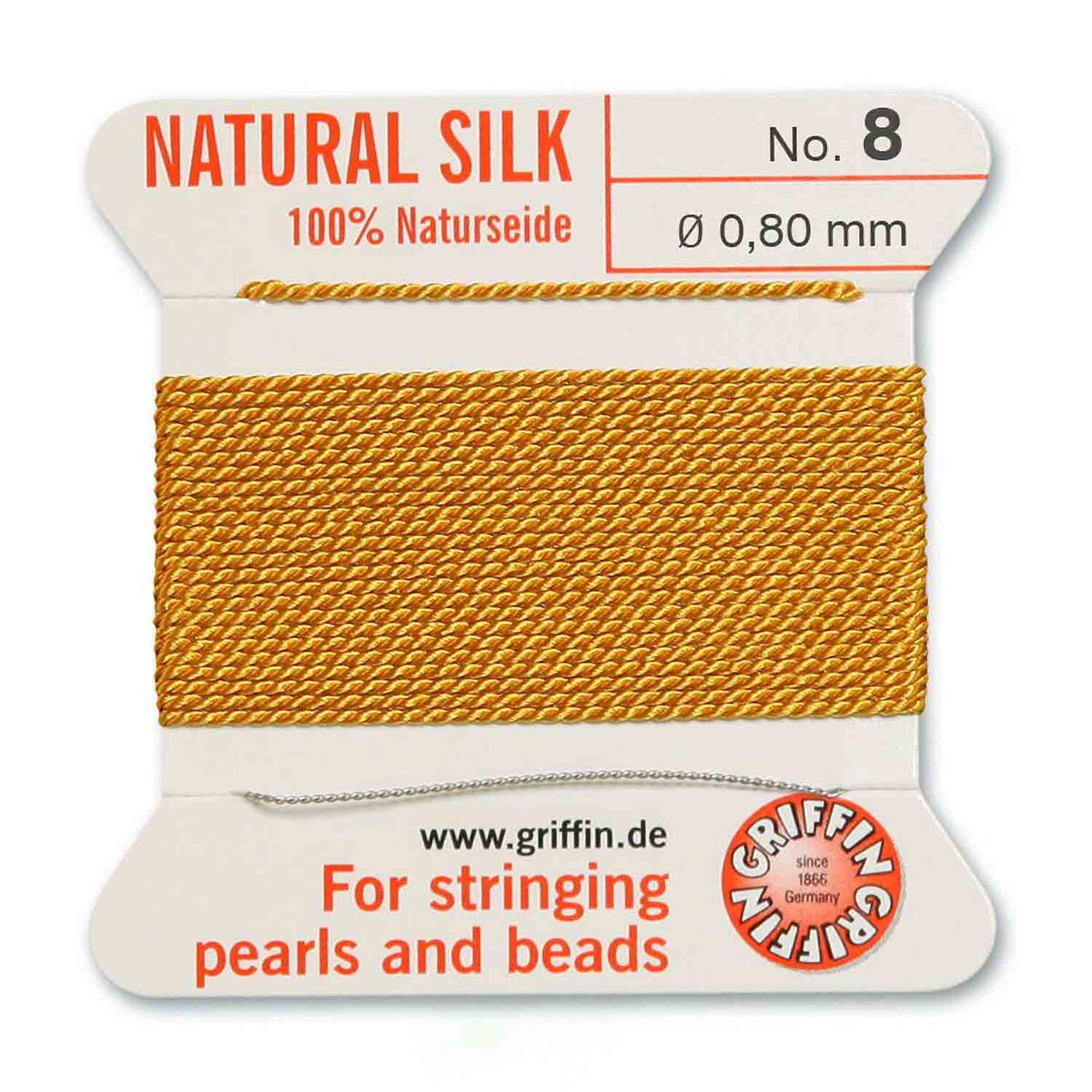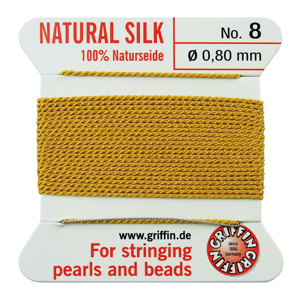 Толстая и прочная шелковая нить для низания бус. Изготовлена из высококачественного натурального 100% шелка, произведена немецкой компанией Griffin. К нити прикреплена стальная скрученная проволочка-иголка для нанизывания бусин. Идеально подходит для использования с жемчугом и натуральными камнями. Цвет темно-желтый, горчичный (amber). Оттенок может немного отличаться от фотографии. Толщина около 0,8 мм. Цена за моток 2 метра.