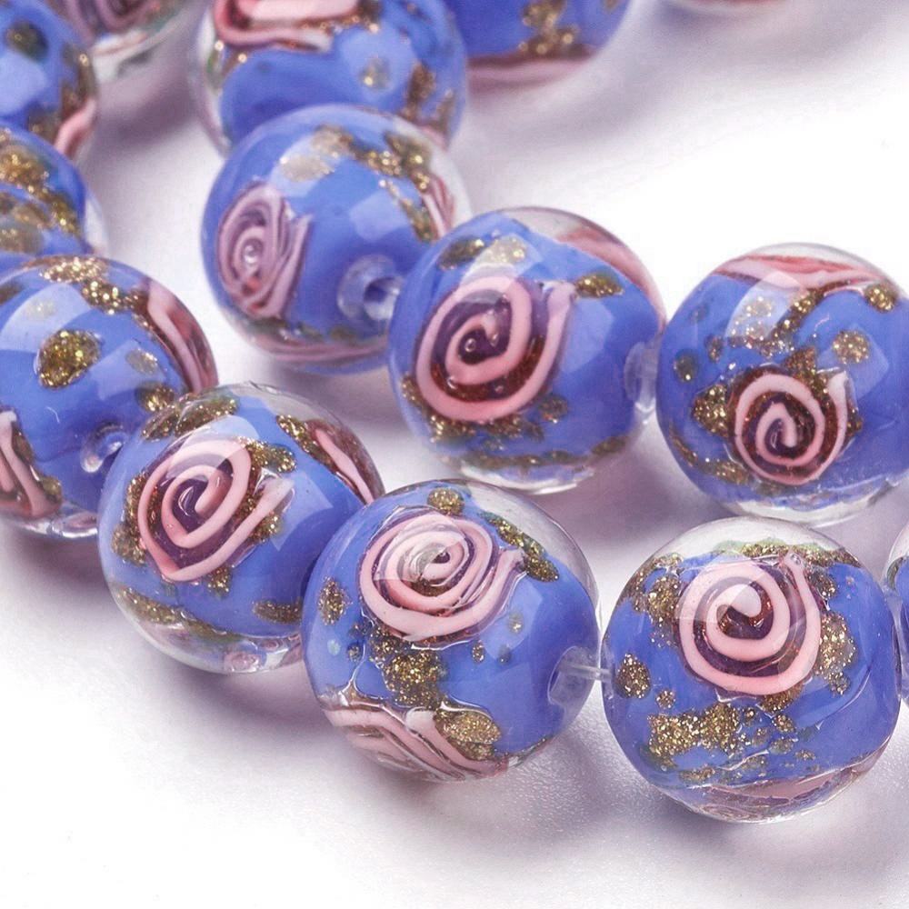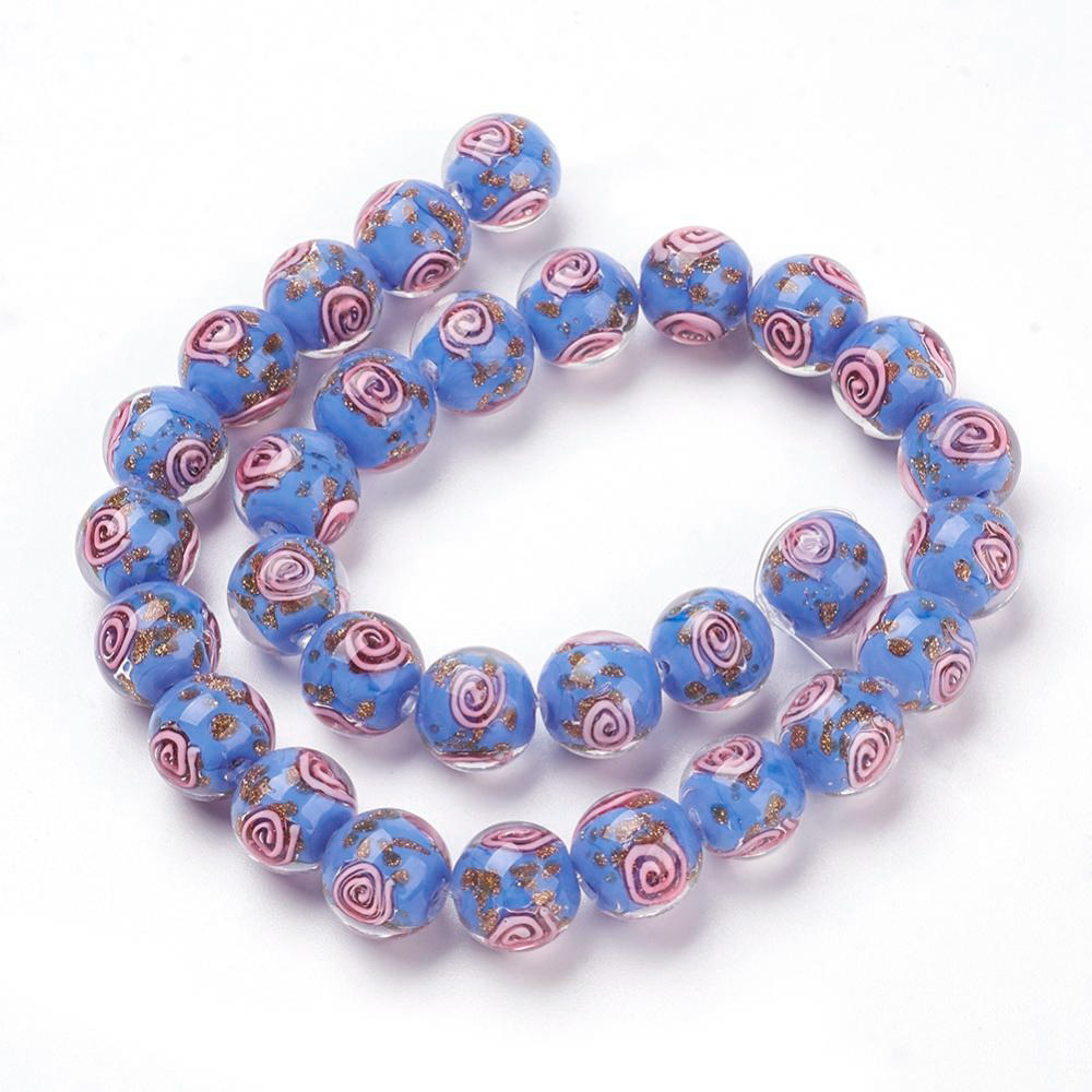 Бусина из стекла в технике lampwork ручной работы. Бусина синего цвета со спиральным узором розового цвета и золотистыми блестками. Оттенок может отличаться от фотографии. Диаметр отверстий - около 1.2-1.6 мм. Бусины могут немного отличаться по форме и размеру. Цена за 2 шт.