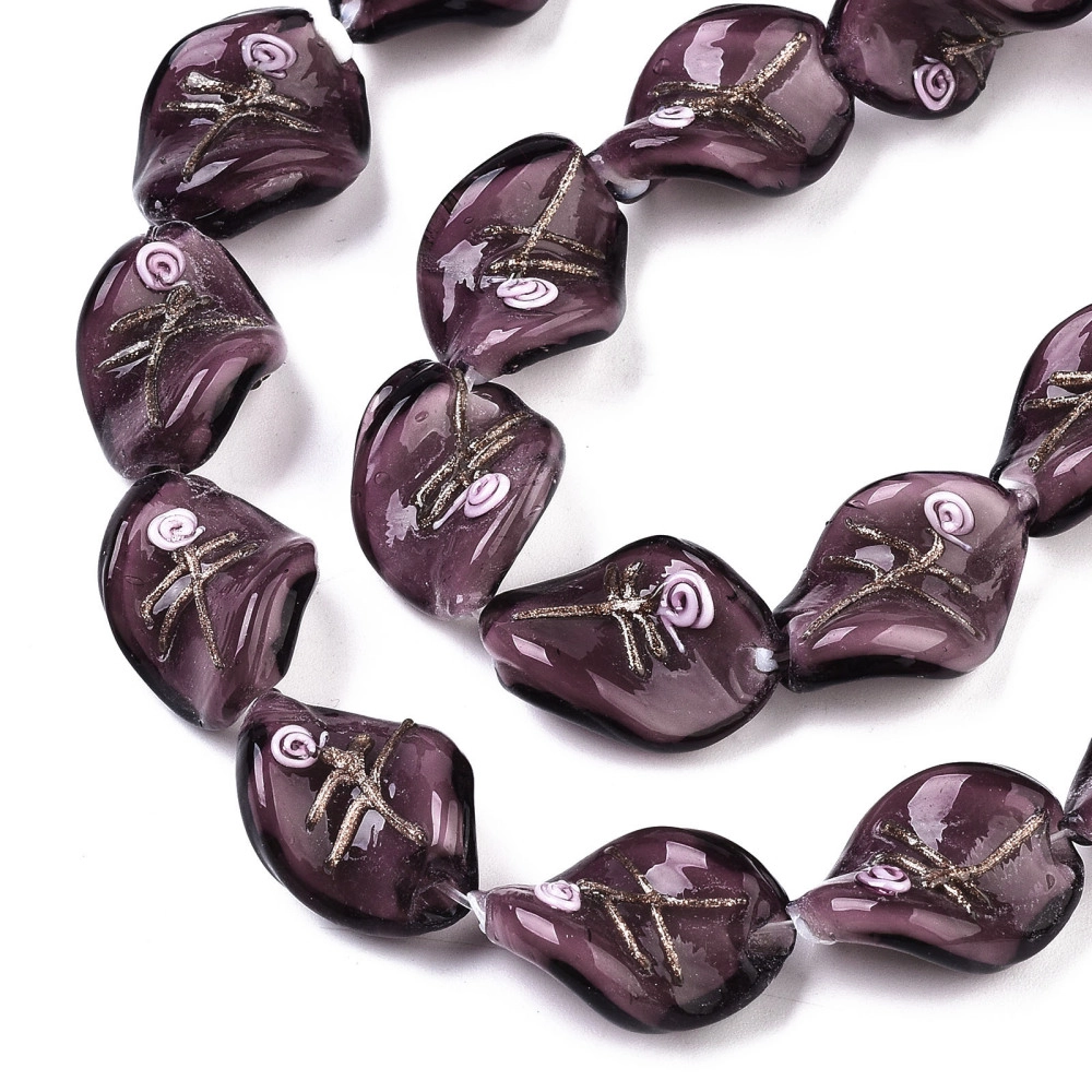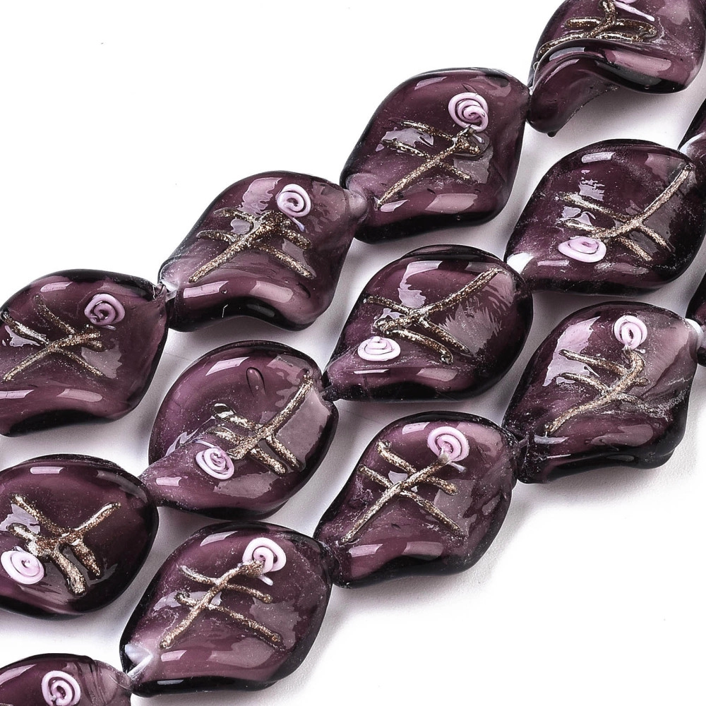 Эффектная витая бусина - стеклянный листик ручной работы. Выполнена из стекла в технике лэмпворк (lampwork). На бусине изображена стилизованная розочка (круглая спираль с золотисто-медным узором). Бусины могут отличаться по форме и размеру. Оттенок может отличаться от фотографии. Цена за 5 шт.