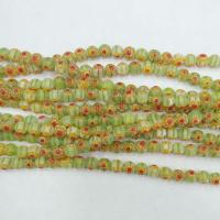 Стеклянные бусины ручной работы, выполнены в технике миллефиори. Бусины полосатые салатово-белые с красно-желтыми цветочками. Оттенок может отличаться от фотографии и от партии к партии. Цена за низку (около 65 бусин).