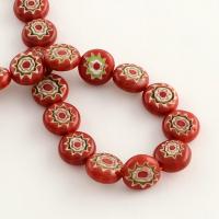 Плоские круглые бусины - из стекла, выполнены вручную в технике миллефьори. Бусины красного цвета с бело-зелеными солнышками по центру. Оттенок может отличаться от фотографии и от партии к партии. Бусины могут немного отличаться по форме и размеру. Цена за низку, в низке около 37 бусин.