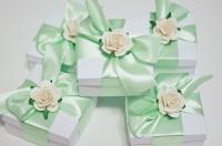 Изящная подарочная коробочка из картона с бантиком из атласной ленты и декоративной бумажной розочкой. Бантик прикреплен к крышечке, коробочка свободно открывается и закрывается. Цена за 1 коробочку.