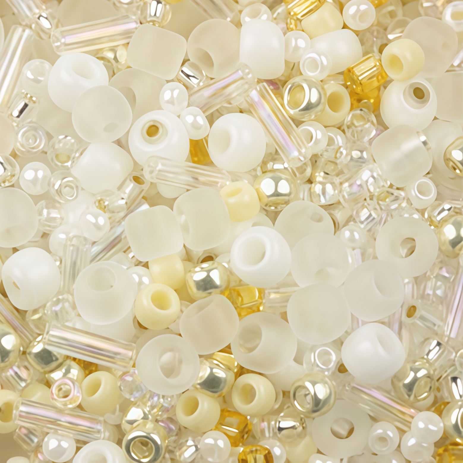 Японский бисер TOHO Mix - микс бисера и стекляруса разных форм, цветов и размеров. Цвет бело-золотой (Hasu- White Mix). Оттенок и состав набора может отличаться от фотографии. Цена за 10 грамм.